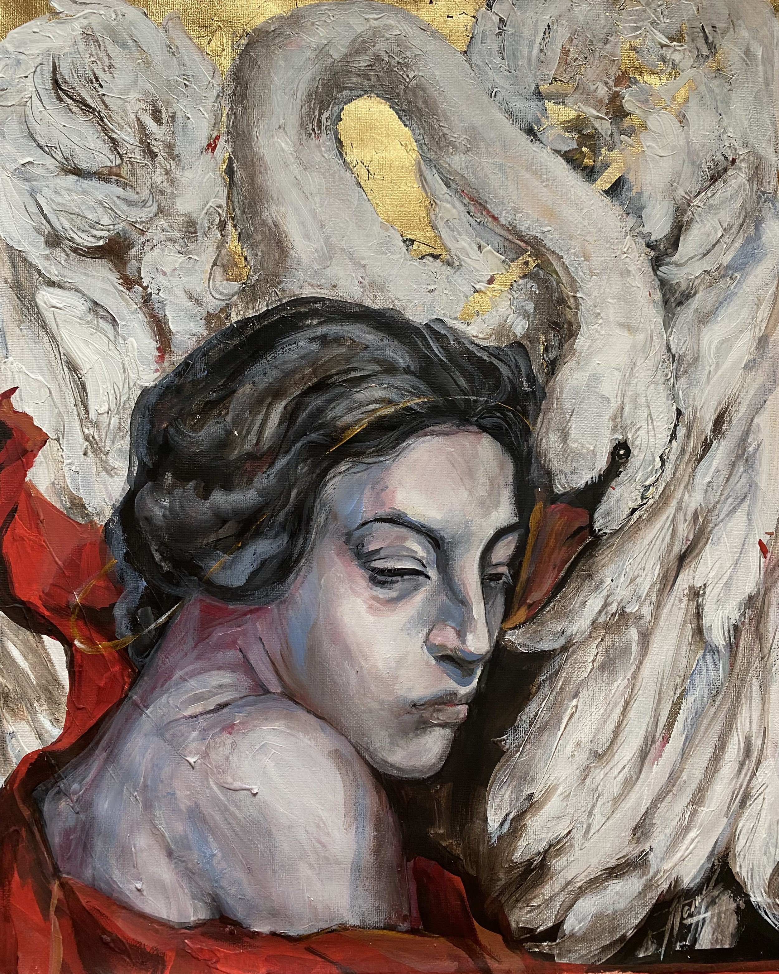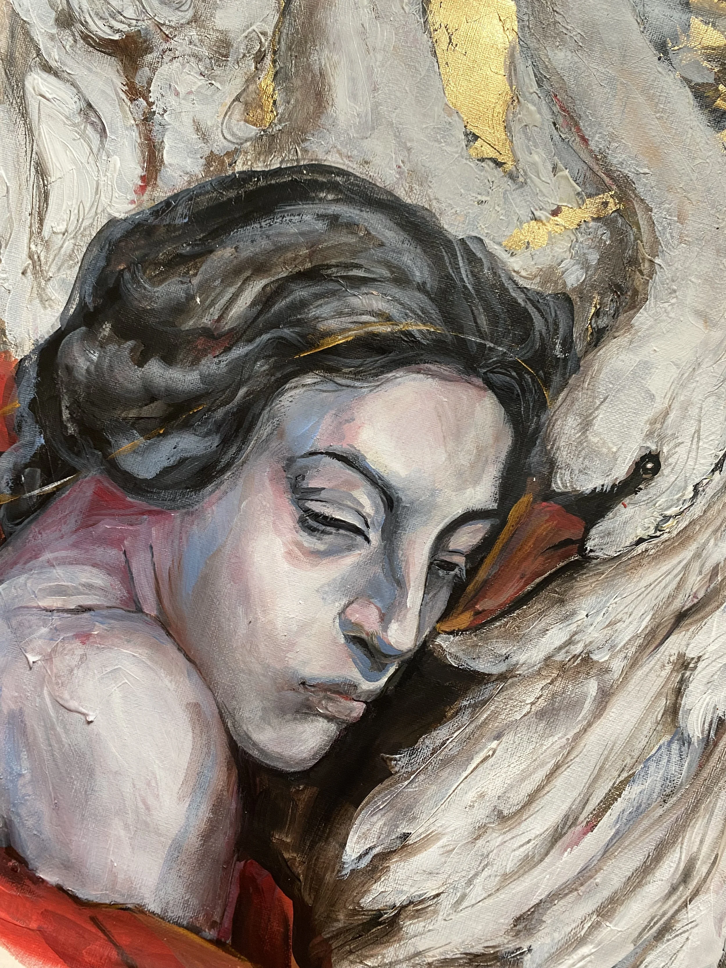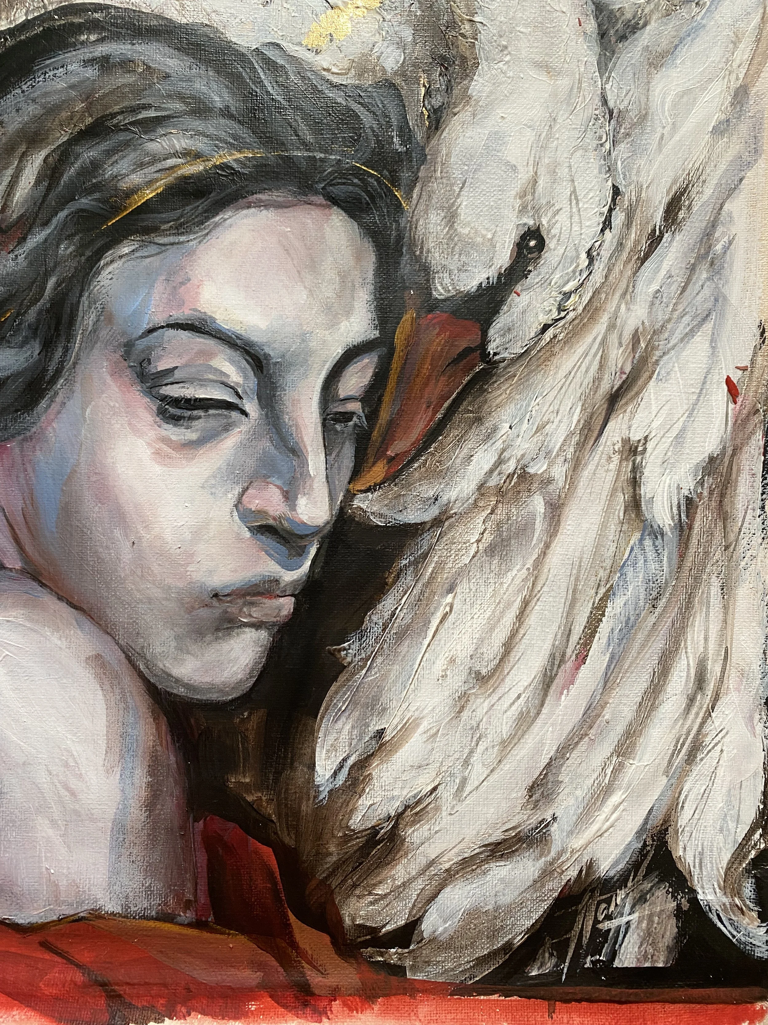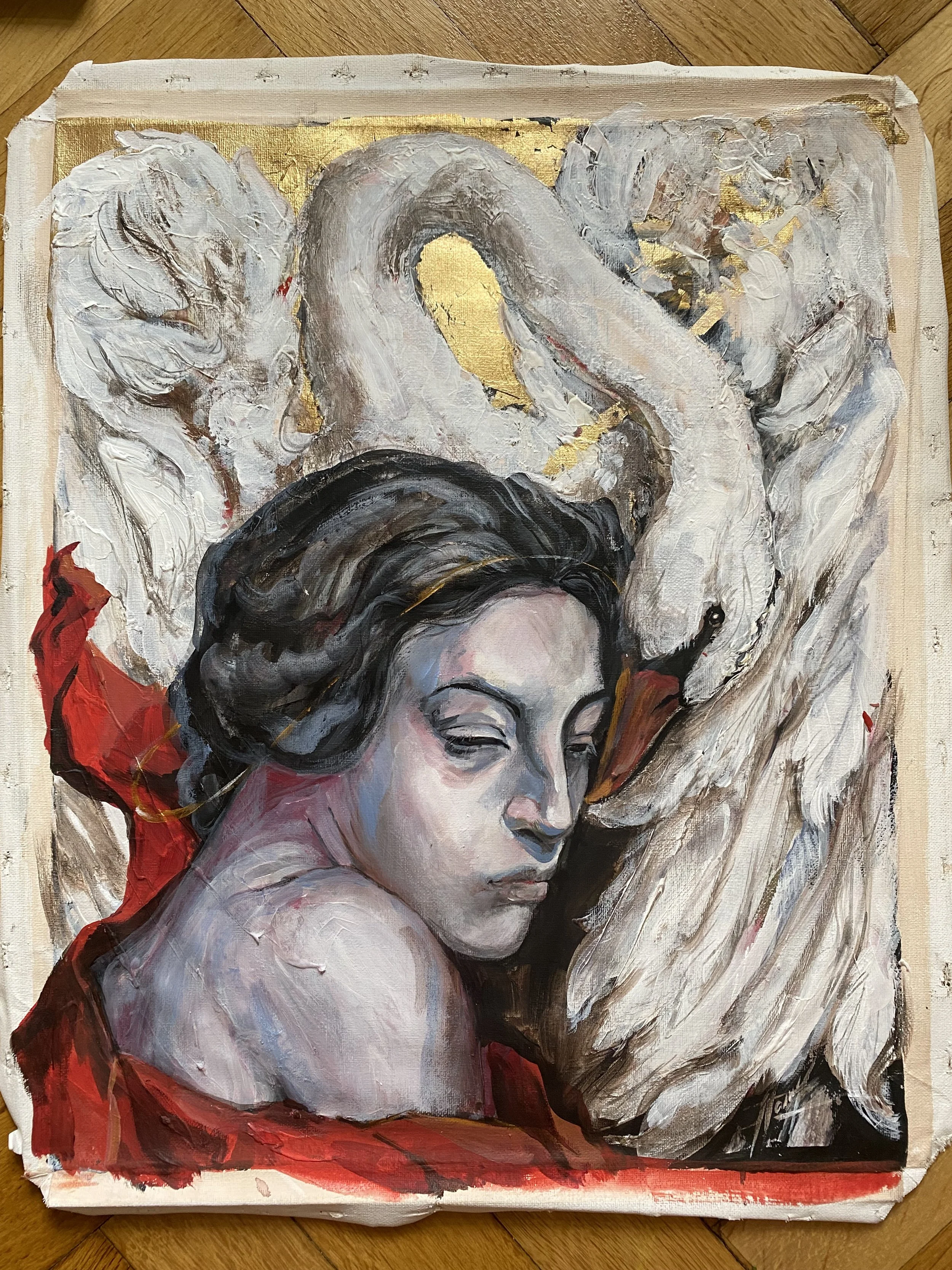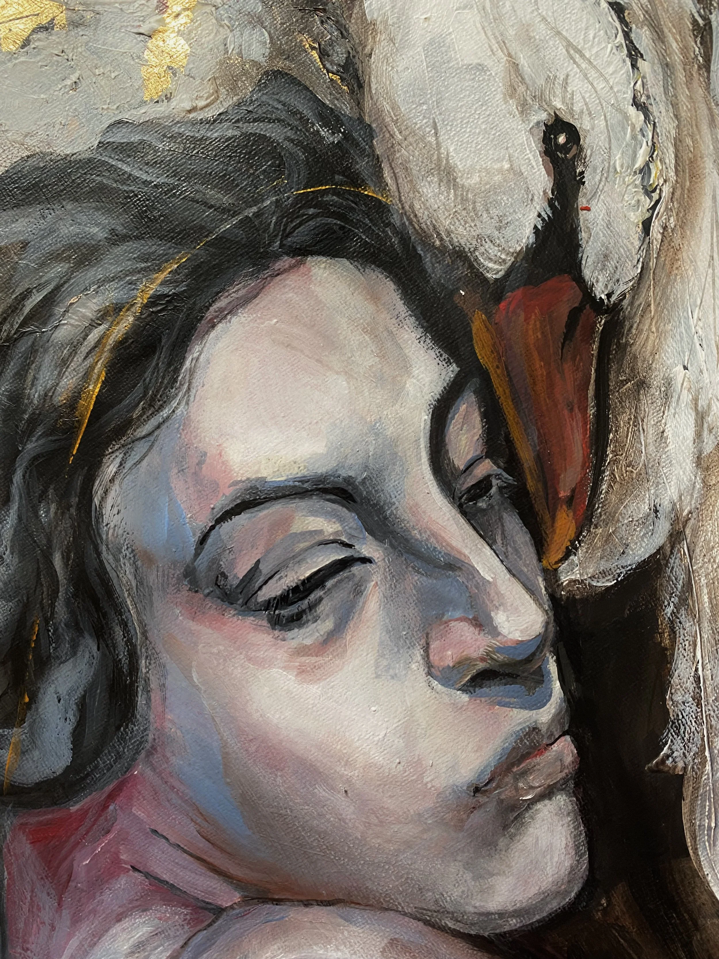 This painting was born from a quiet moment — one of those evenings when everything feels still and distant. The swan became a symbol of calm for me, something pure and steady to hold onto. I painted her close to the woman, almost as if they were part of each other, sharing the same breath.