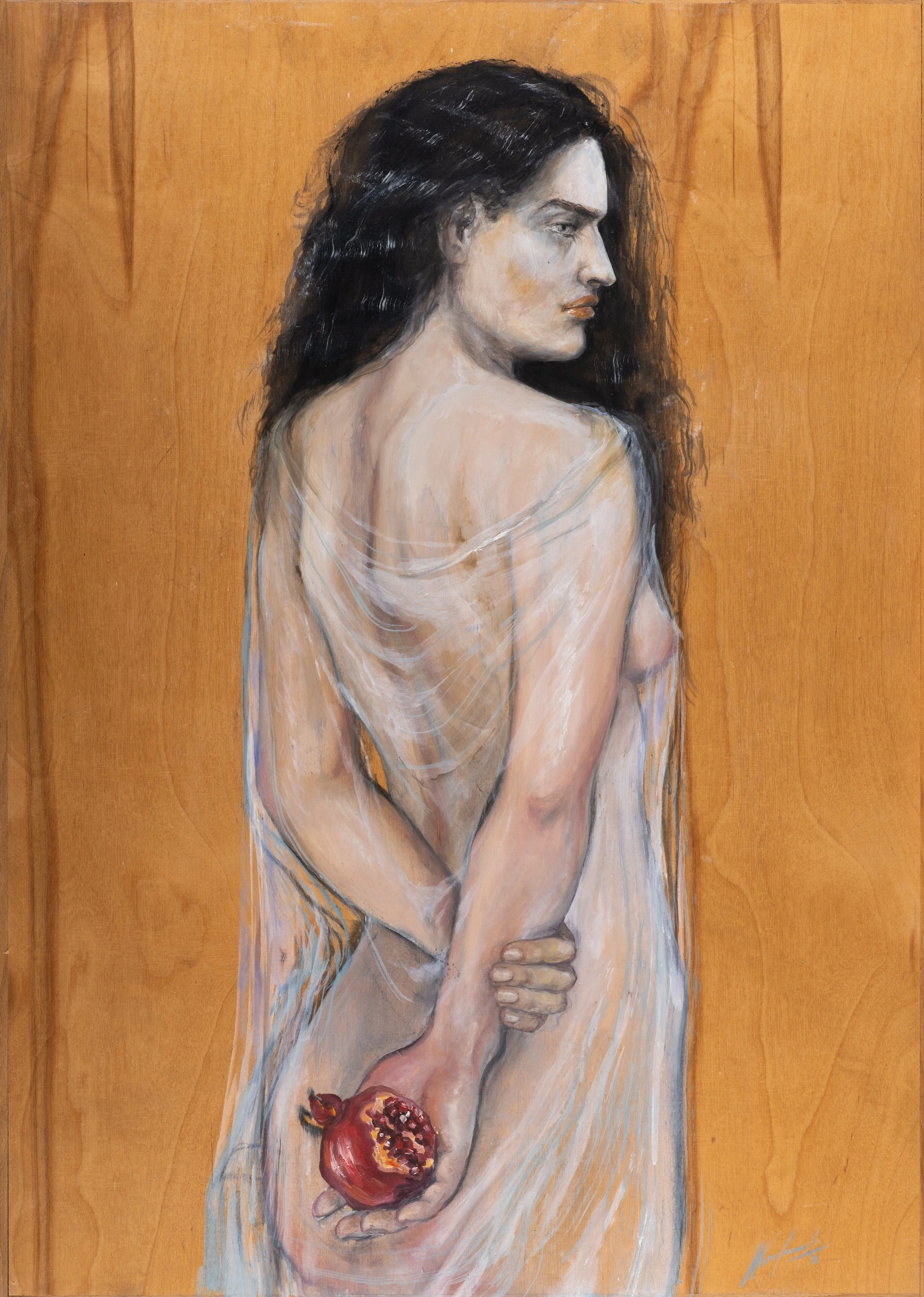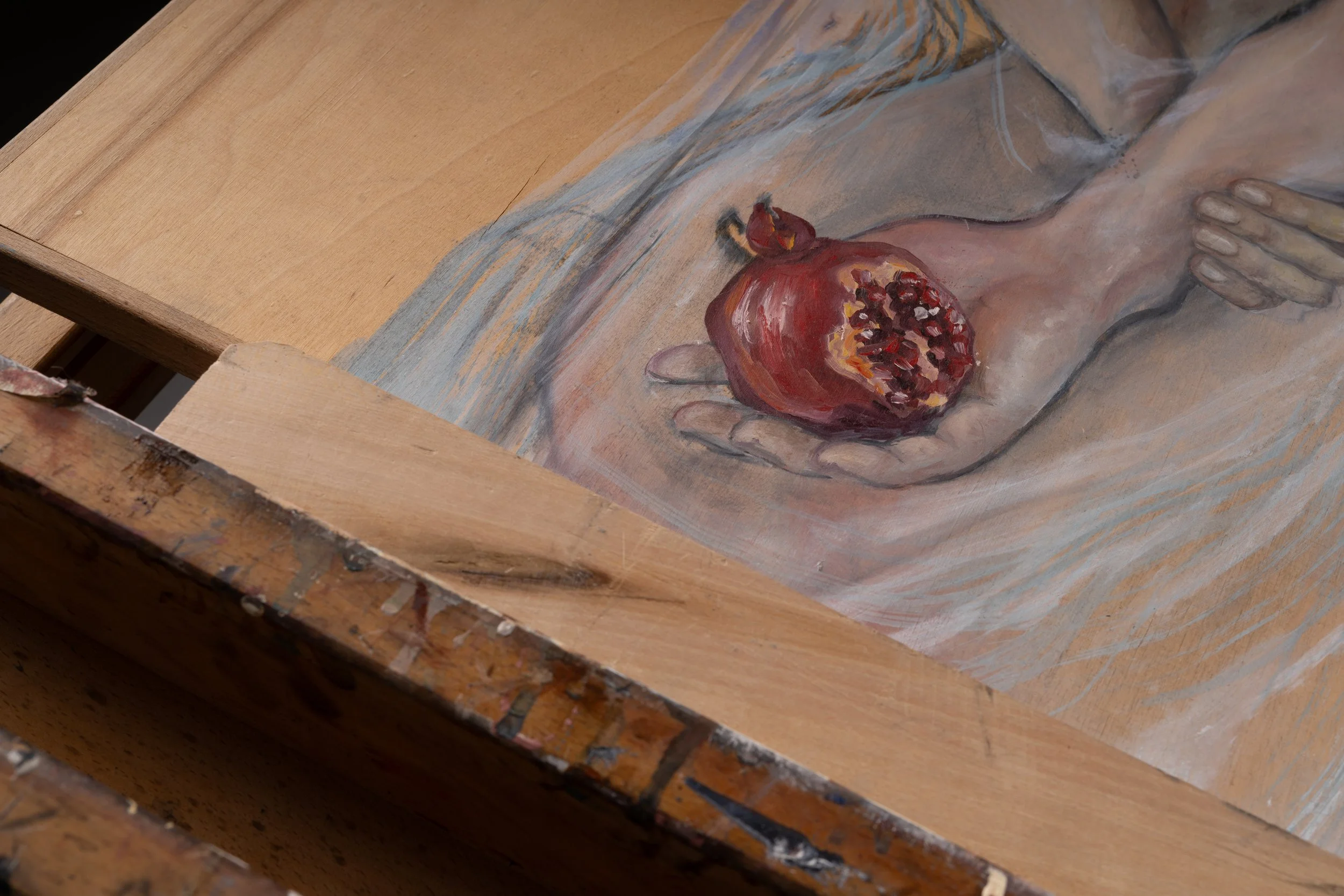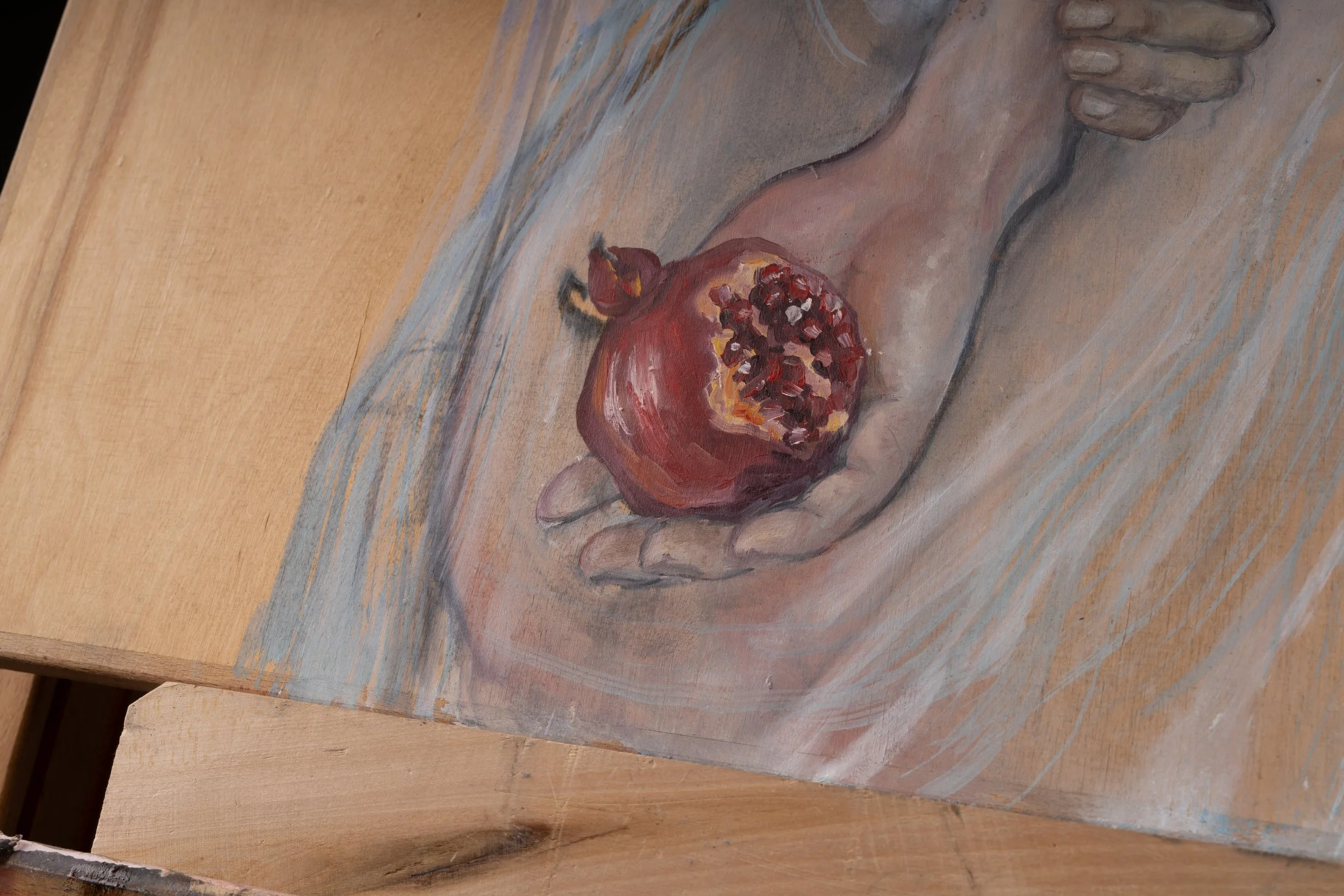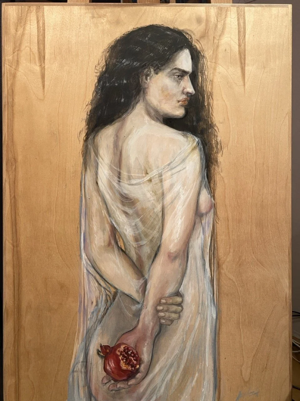 This painting was inspired by the myth of Persephone — a story I’ve always found both beautiful and unsettling. I didn’t want to paint her as a goddess, but as a woman caught between two worlds, holding something that is both life and burden.