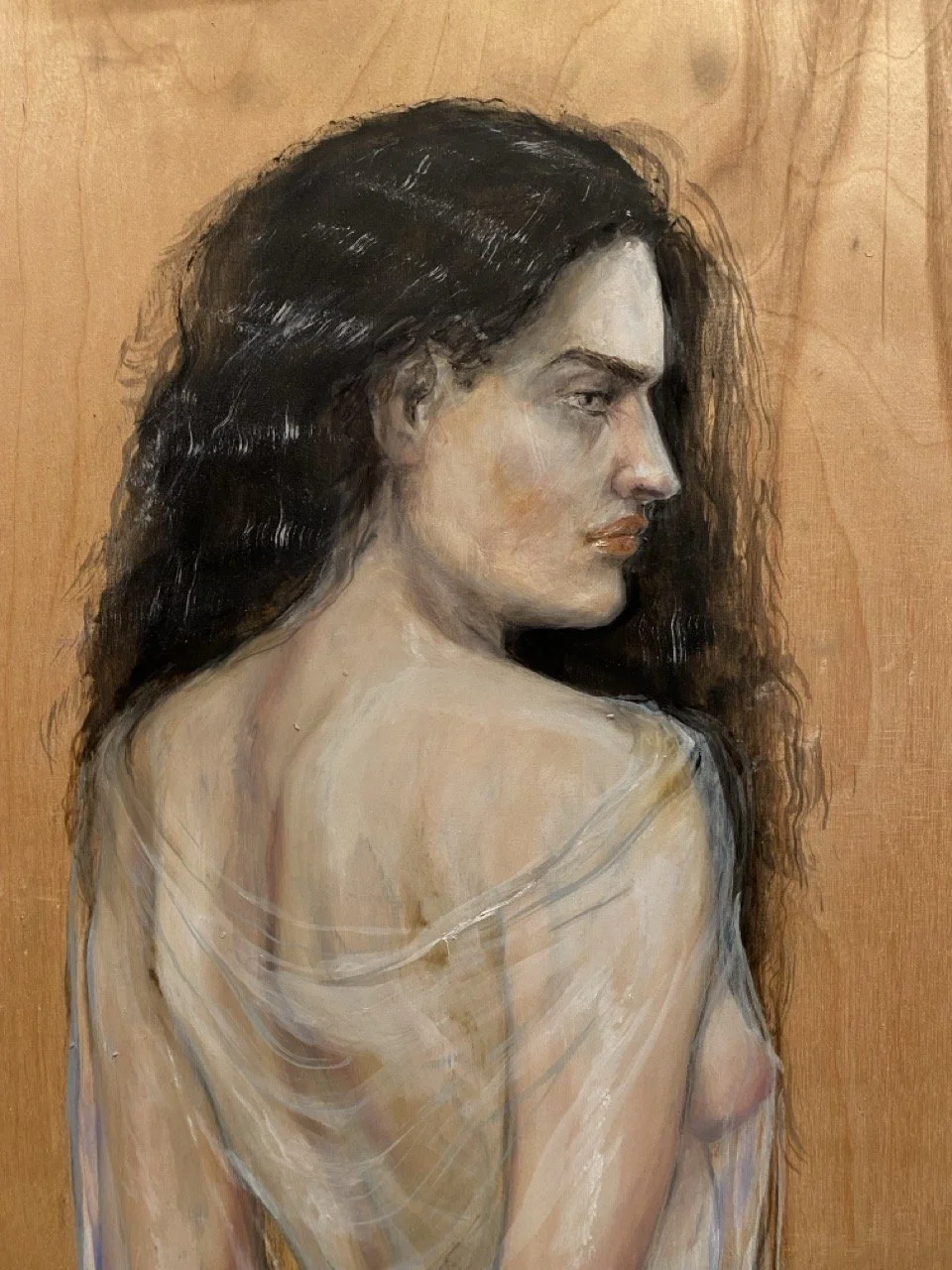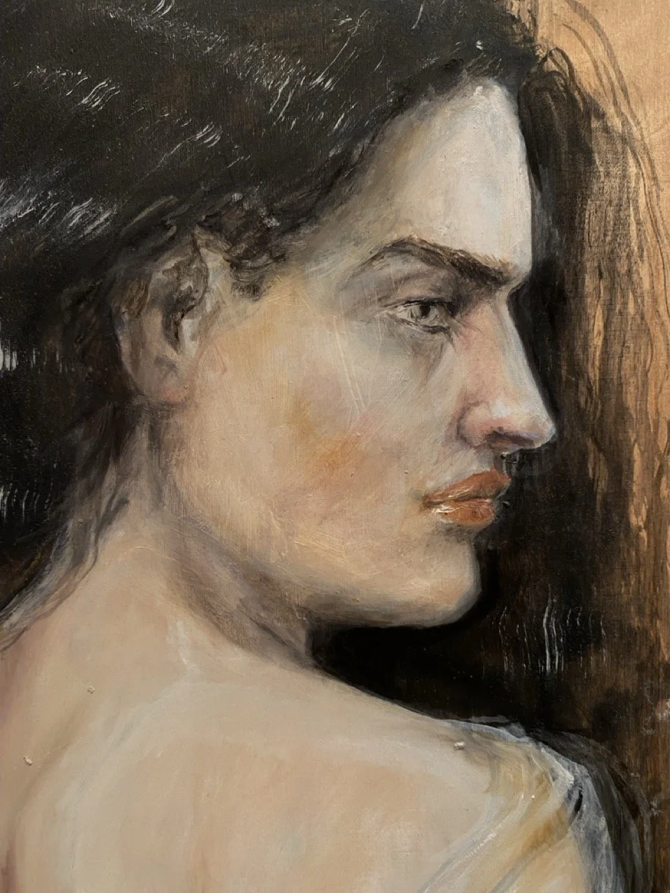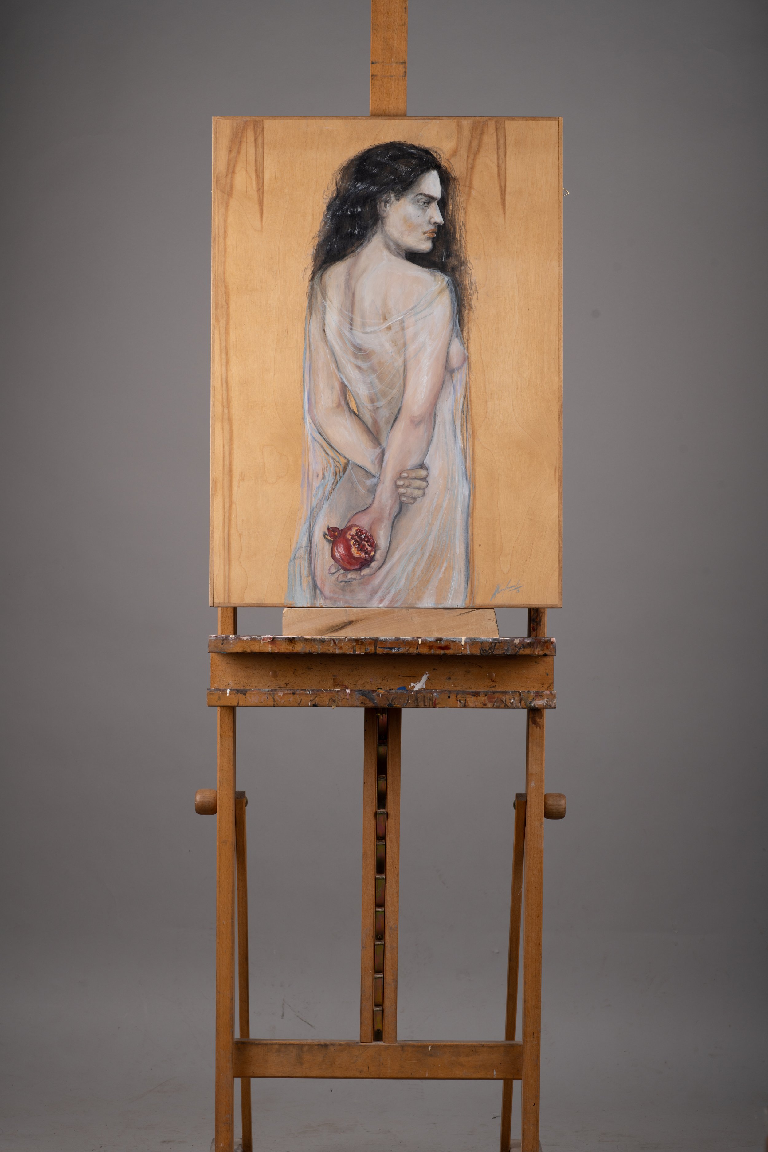 This painting was inspired by the myth of Persephone — a story I’ve always found both beautiful and unsettling. I didn’t want to paint her as a goddess, but as a woman caught between two worlds, holding something that is both life and burden.