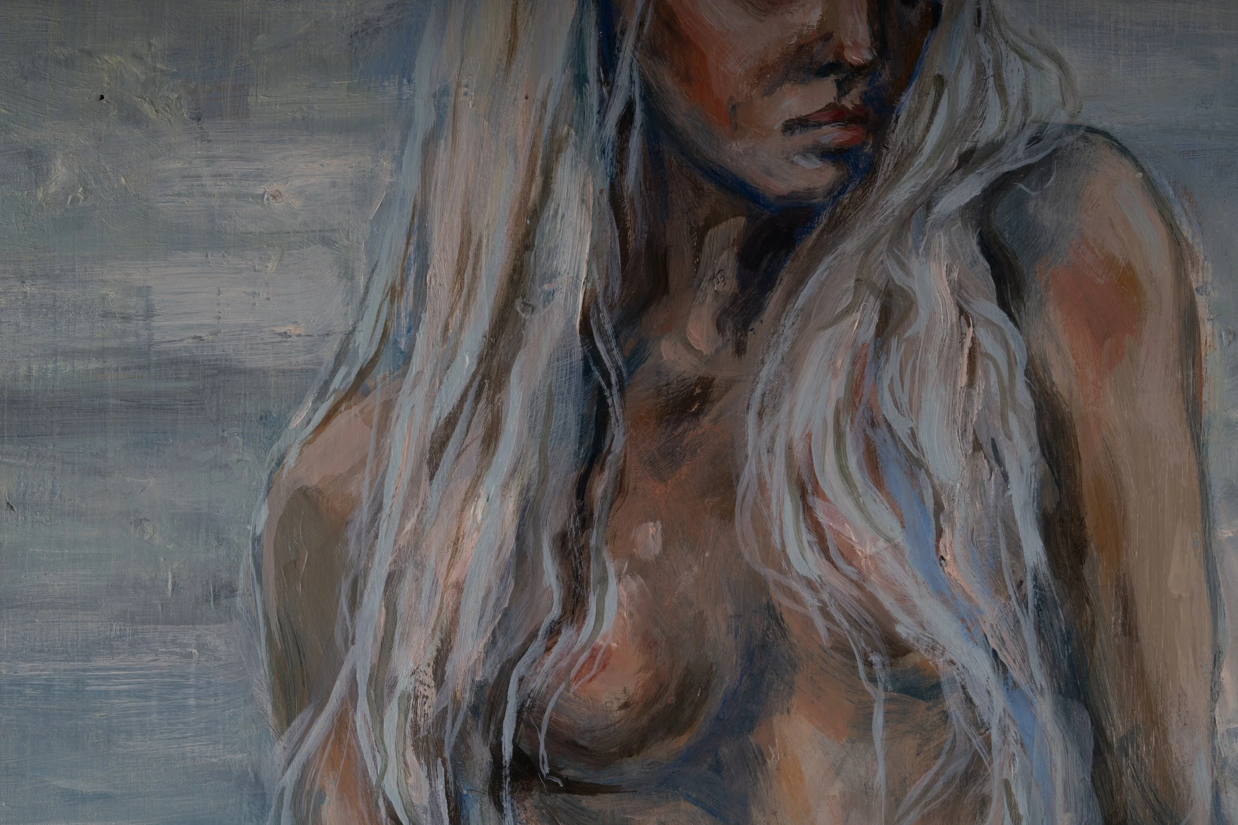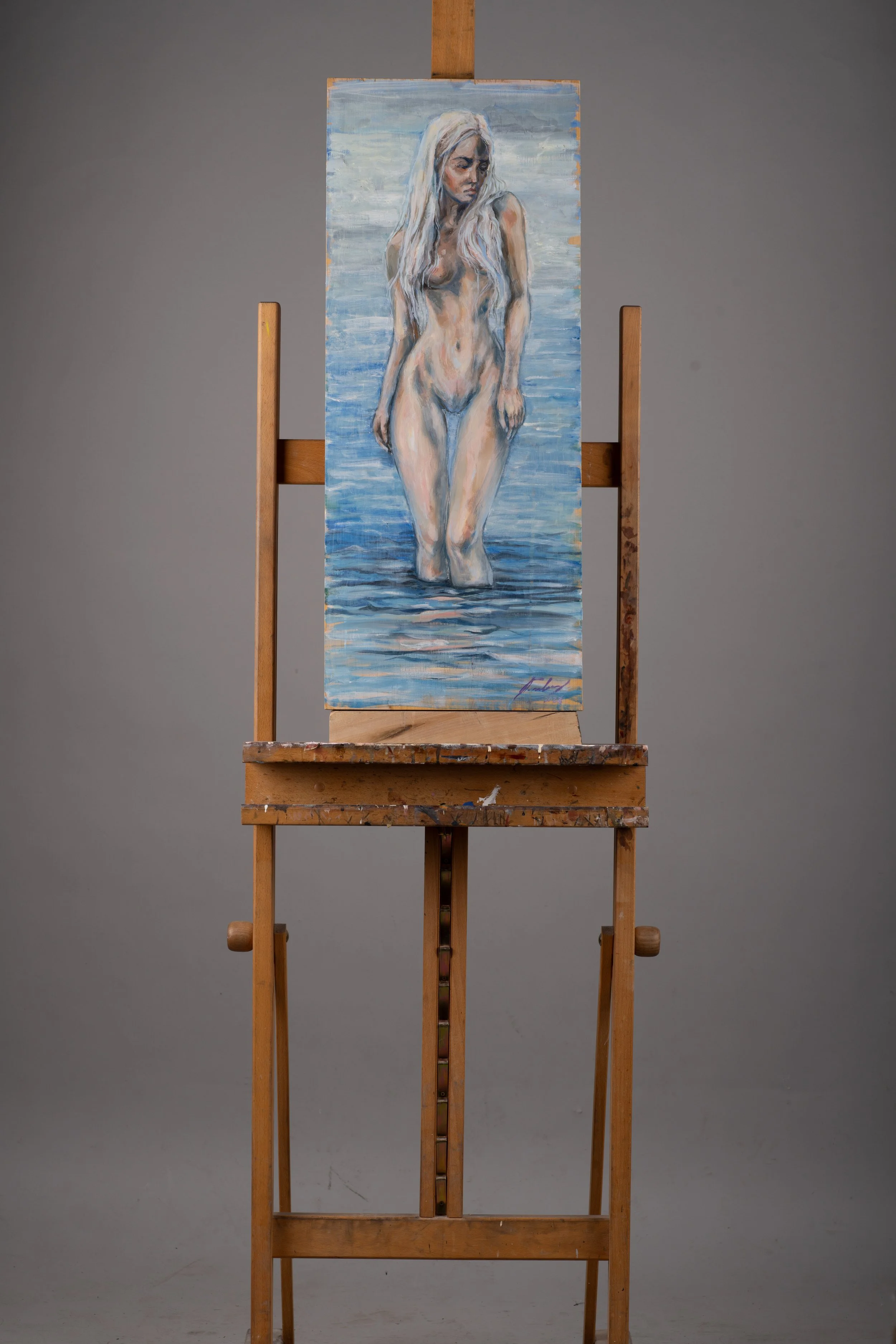 This painting grew out of my interest in capturing quiet, introspective moments. I was drawn to the way the figure interacts with the water — standing, still, yet part of a living, moving world.
