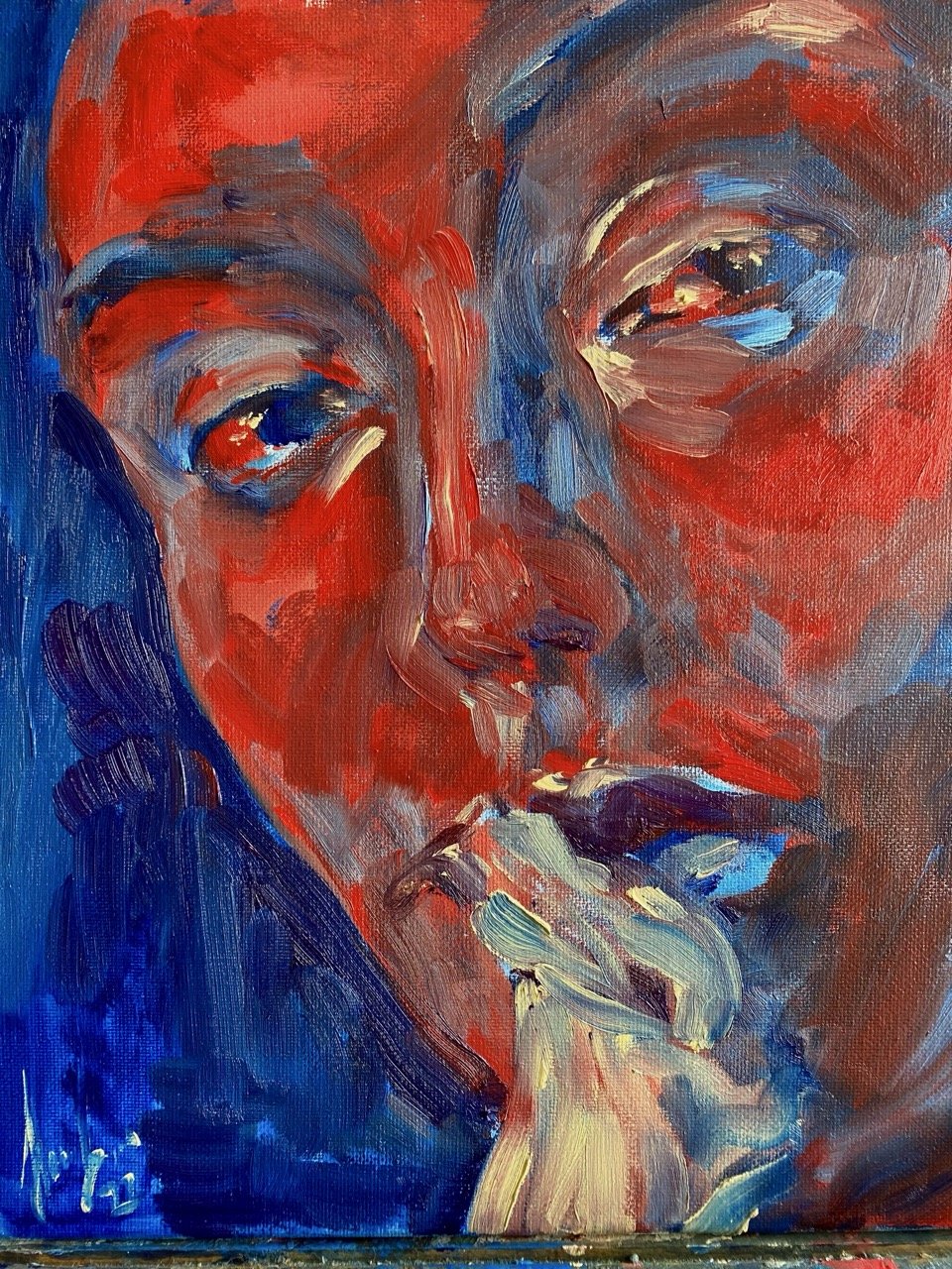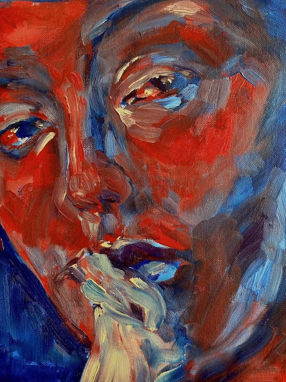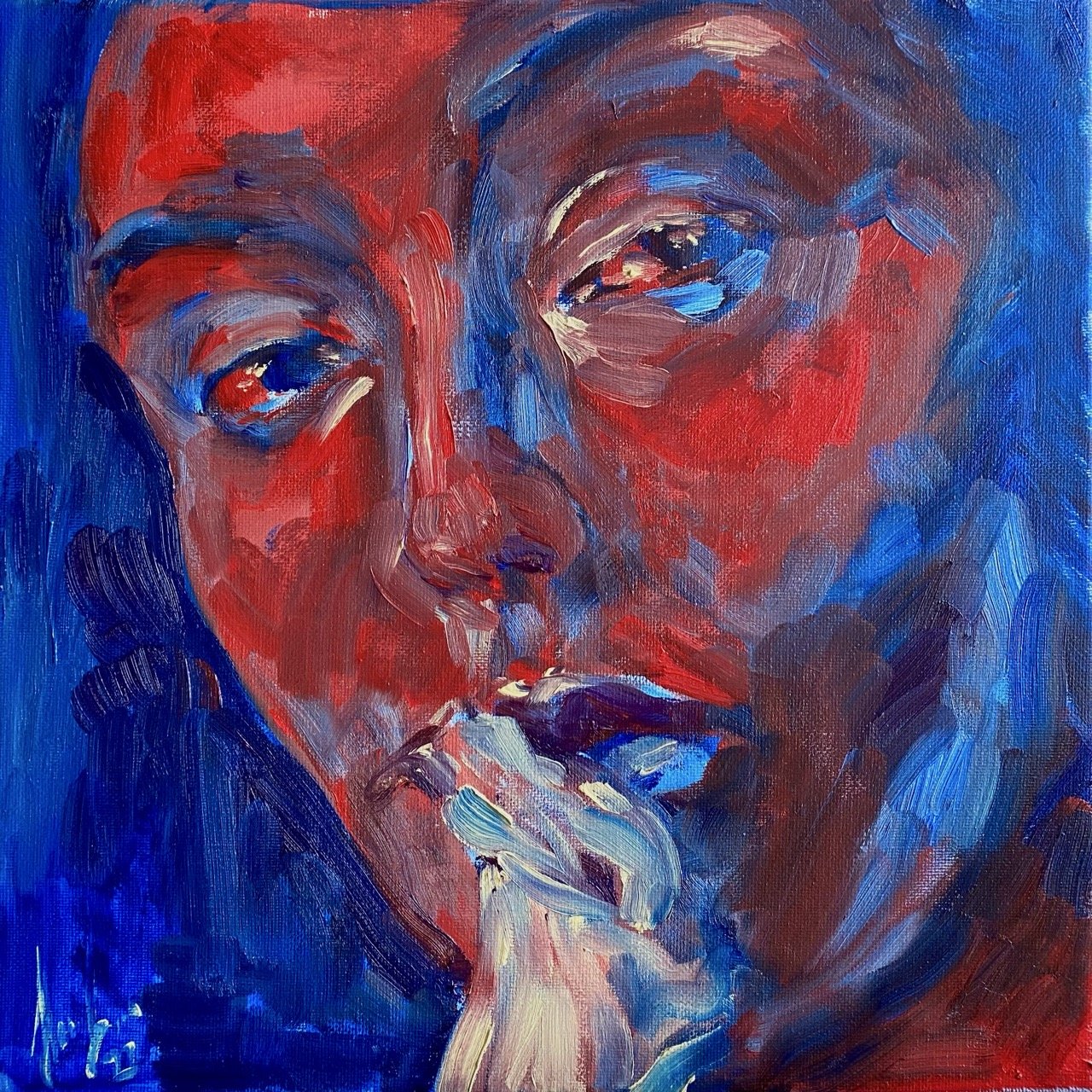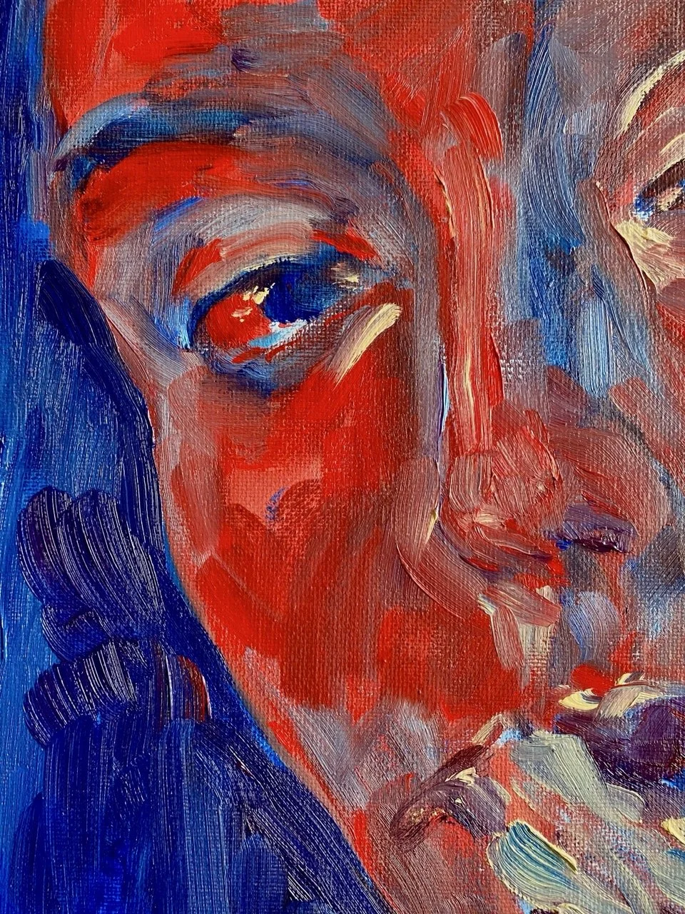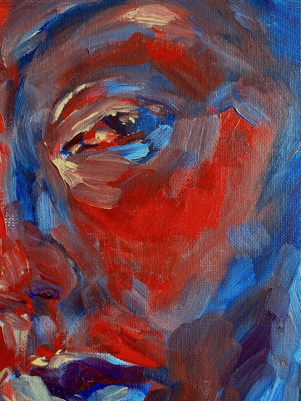 The colors — red and blue — became a way to show that tension. They fight each other a little, but they also belong together. The brushstrokes are rough and fast, almost like trying to catch a thought before it disappears.