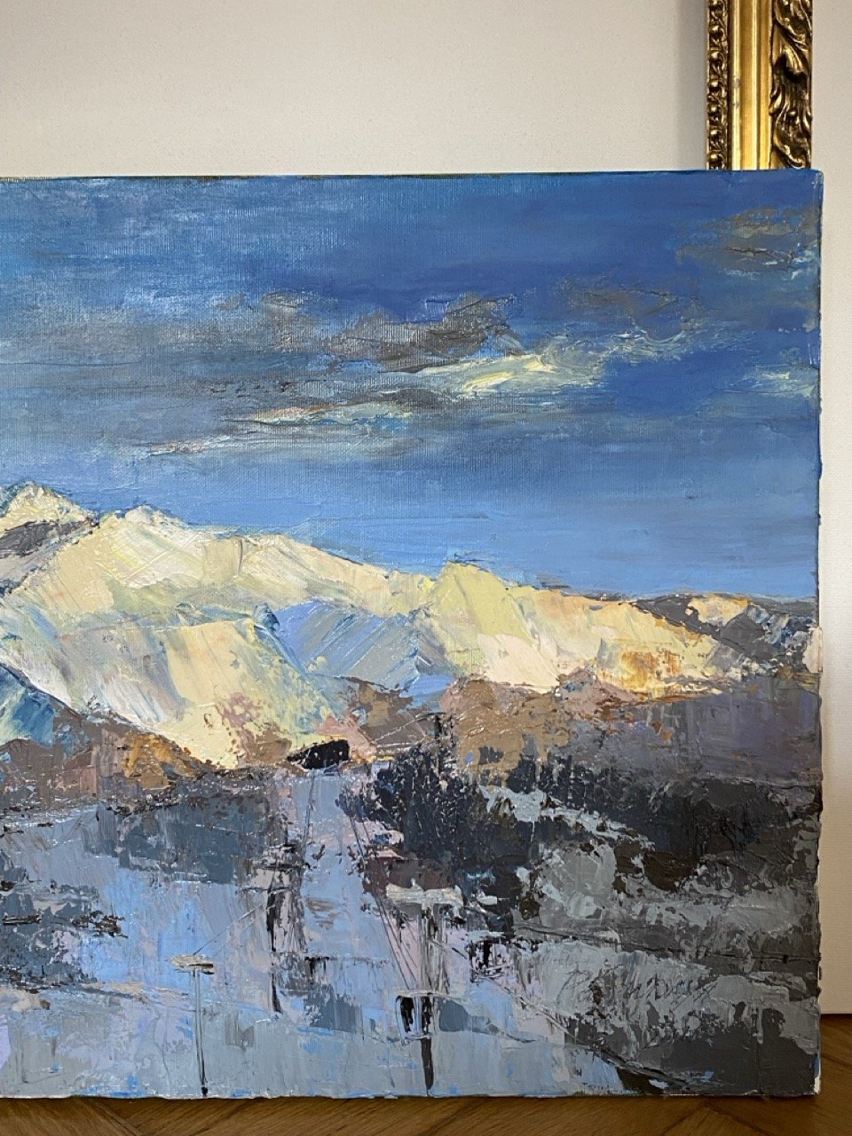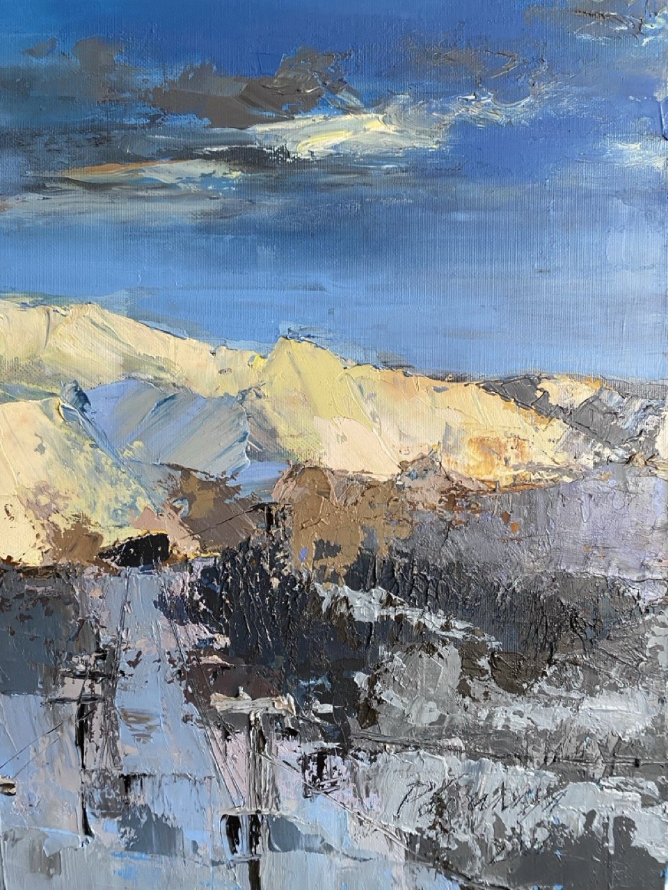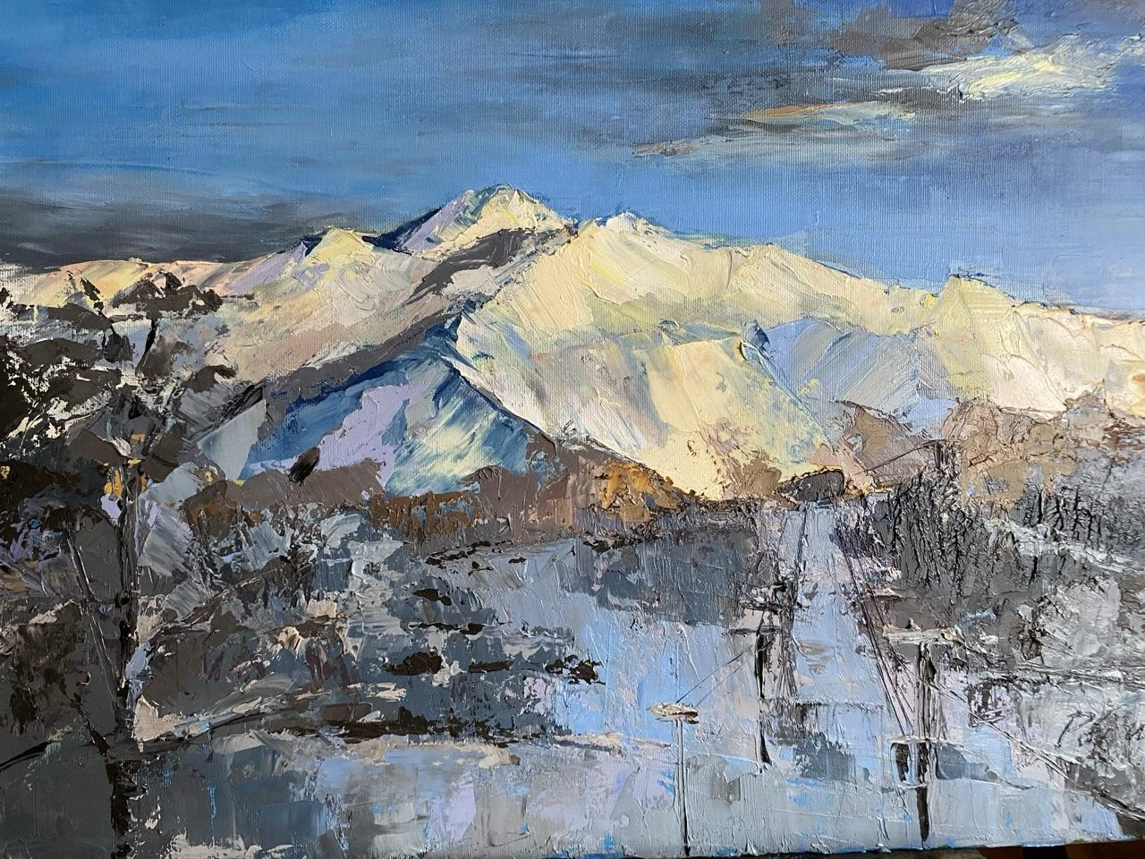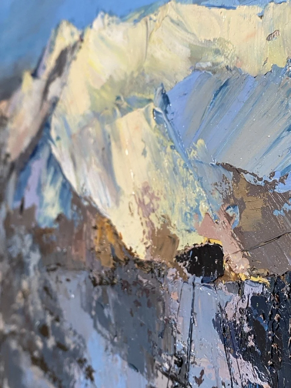 I painted it in my studio on a quiet winter day. The colors came together naturally — cool blues, soft grays, and touches of yellow to catch the light. I wanted to keep the feeling simple and honest, like standing in the cold air and watching the peaks disappear into the clouds.