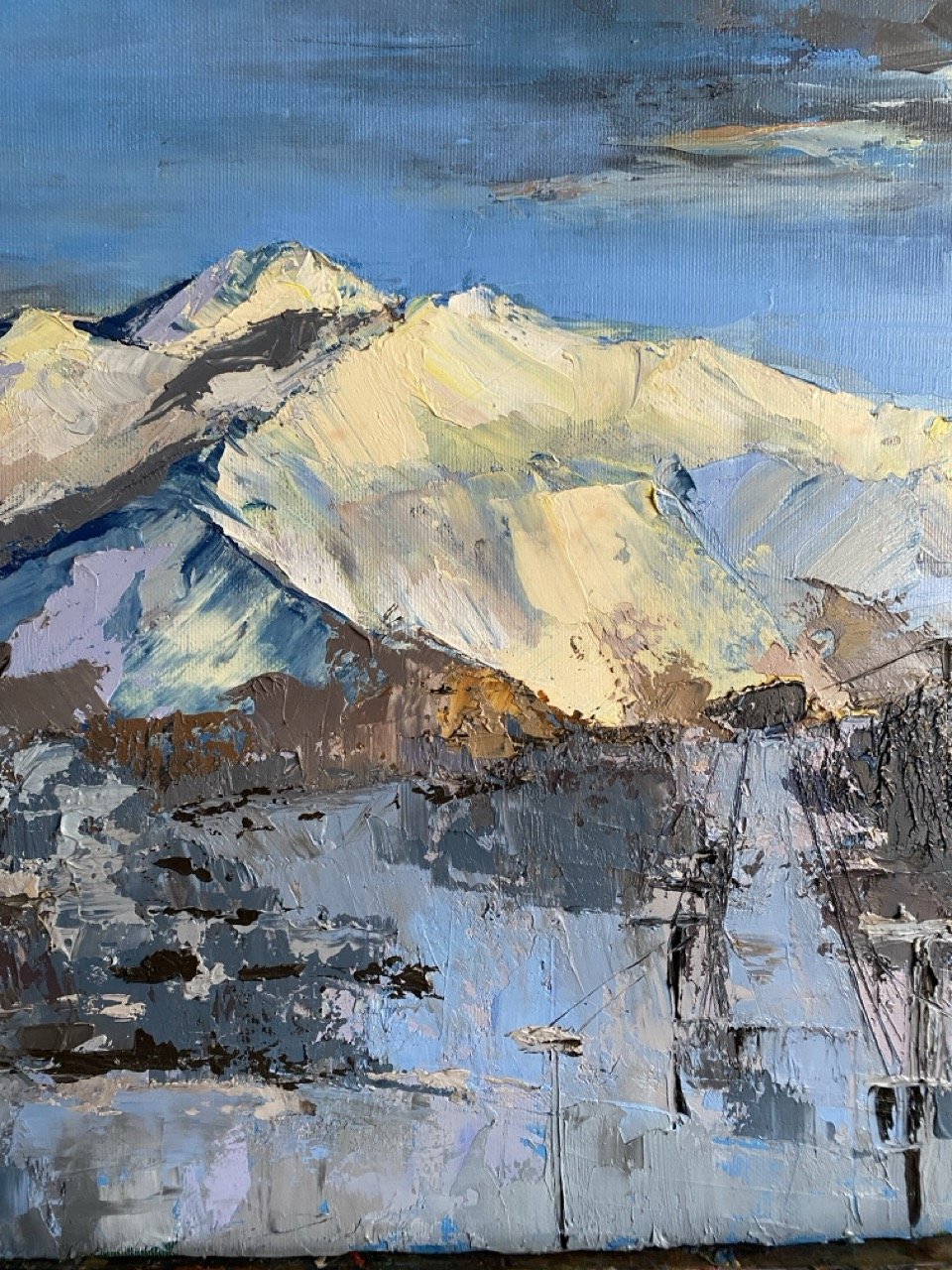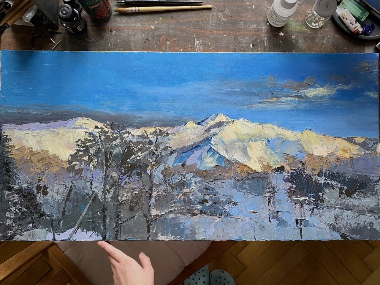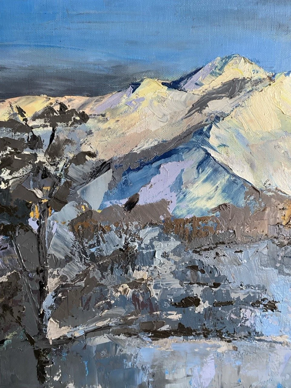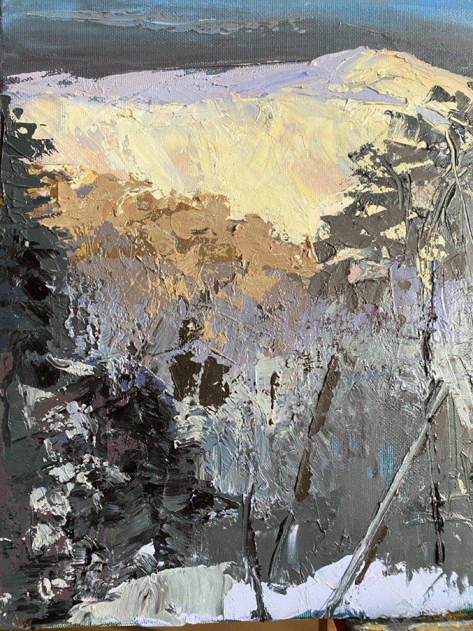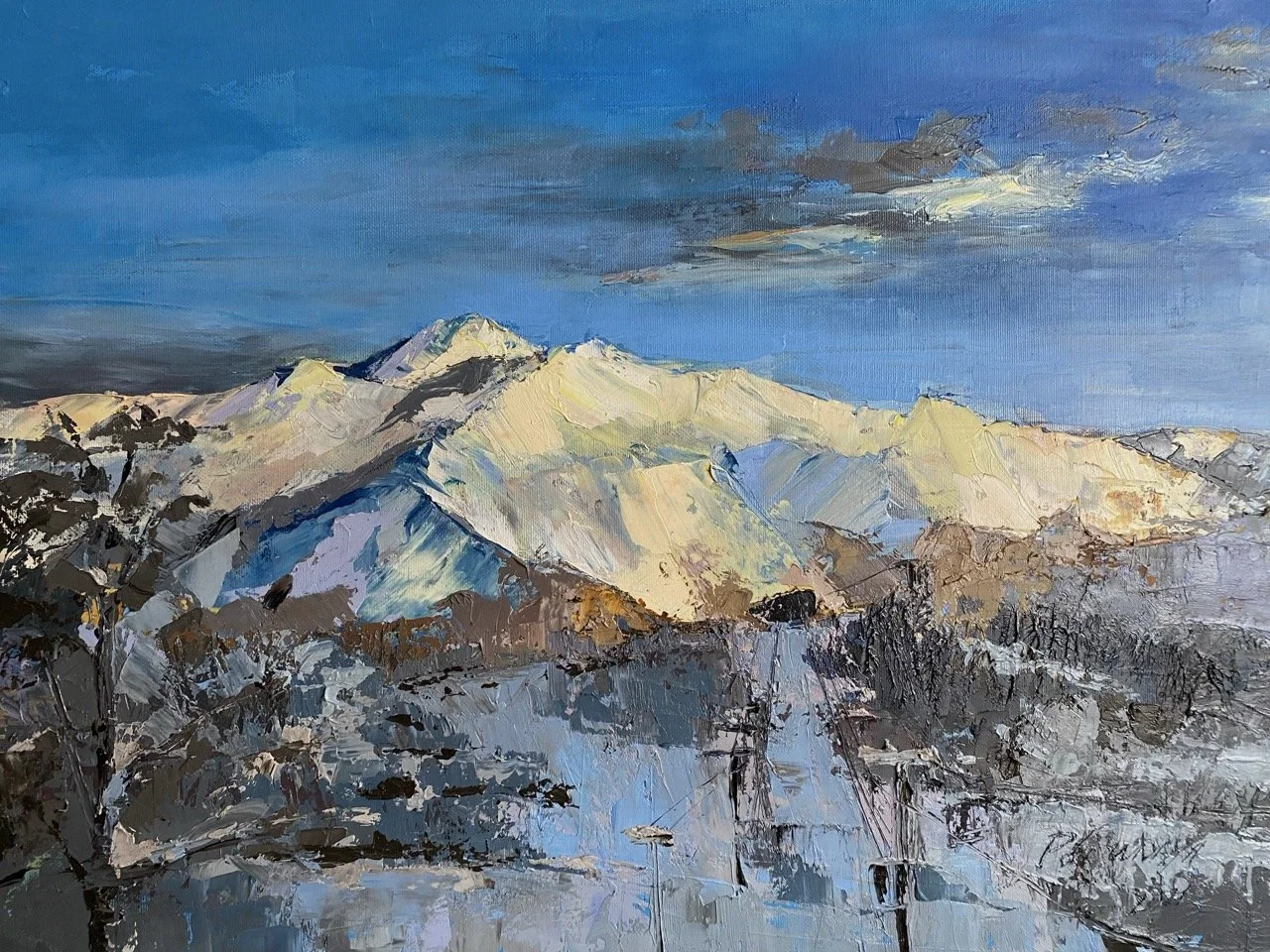 I painted it in my studio on a quiet winter day. The colors came together naturally — cool blues, soft grays, and touches of yellow to catch the light. I wanted to keep the feeling simple and honest, like standing in the cold air and watching the peaks disappear into the clouds.