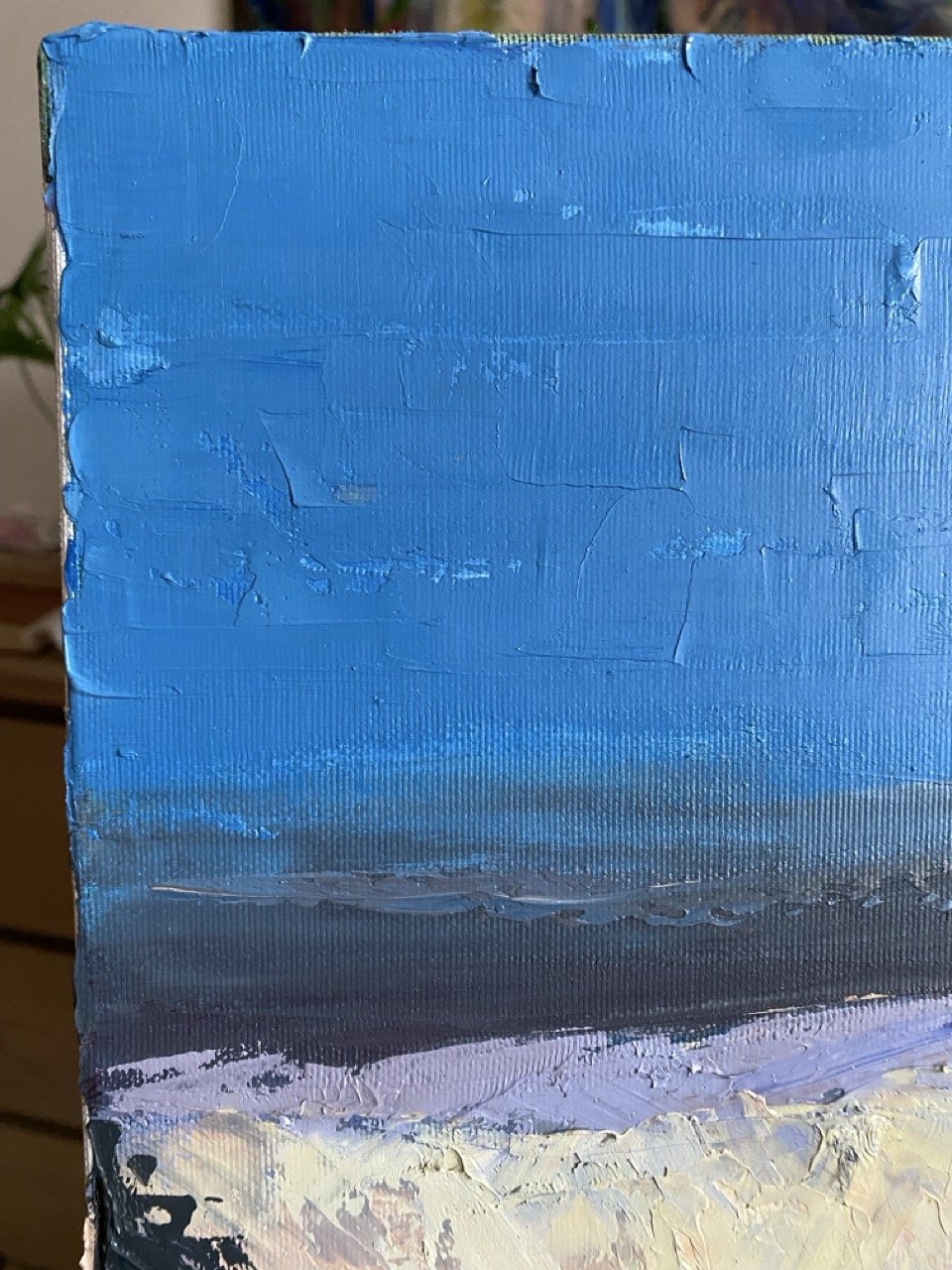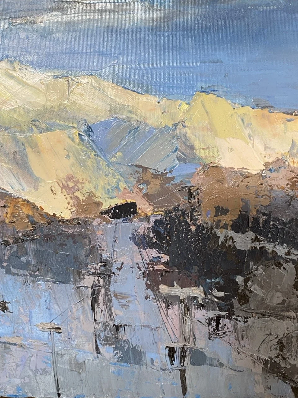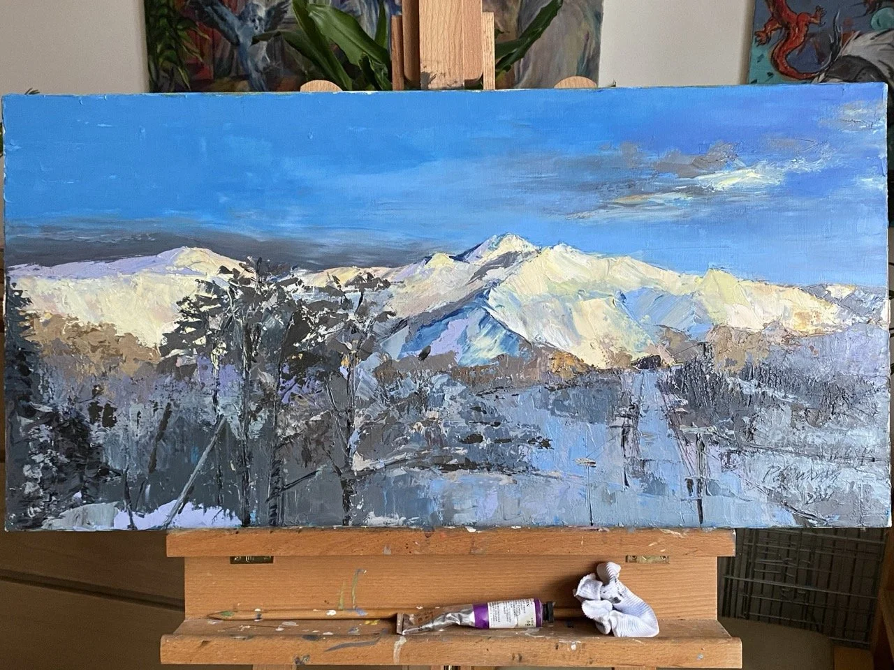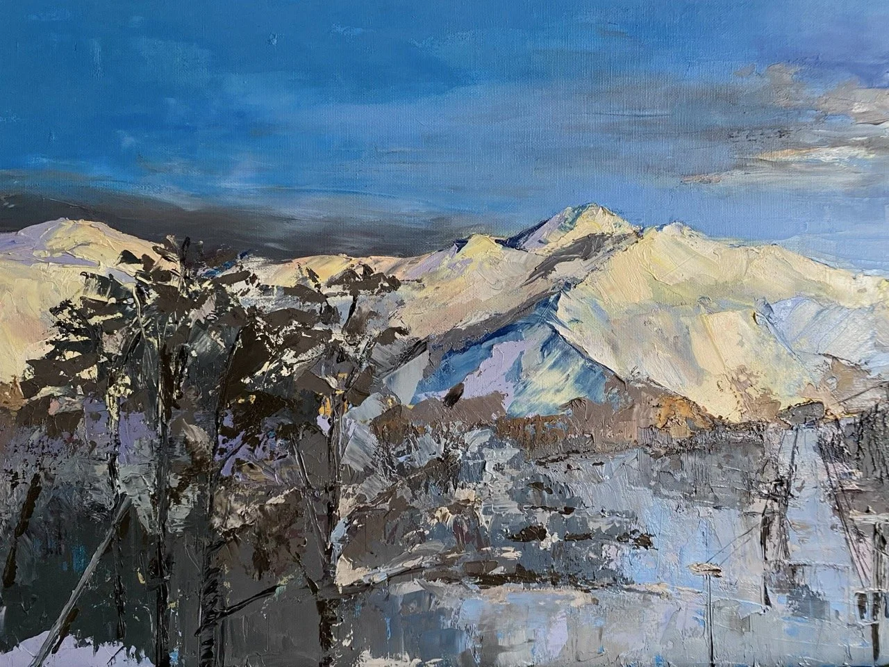 I painted it in my studio on a quiet winter day. The colors came together naturally — cool blues, soft grays, and touches of yellow to catch the light. I wanted to keep the feeling simple and honest, like standing in the cold air and watching the peaks disappear into the clouds.