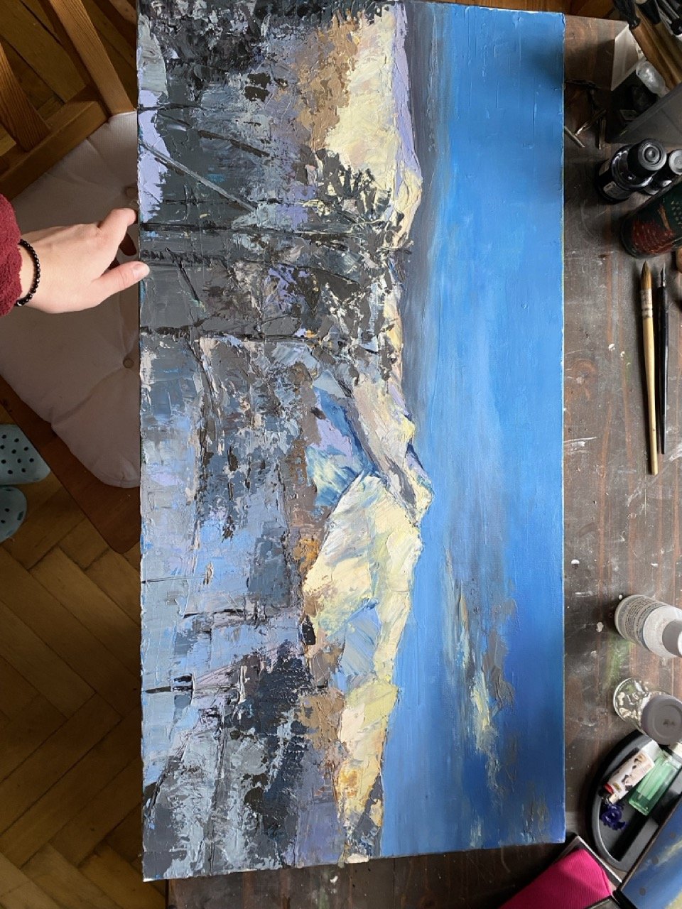 This painting was inspired by my memories of the mountains — their silence, their strength, and the way the light shifts across the snow. The Caucasus has always felt like a place that breathes slowly, where time stretches and the world feels both distant and close.