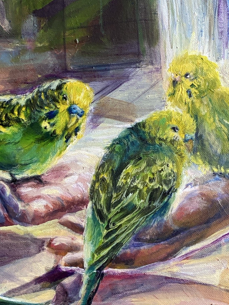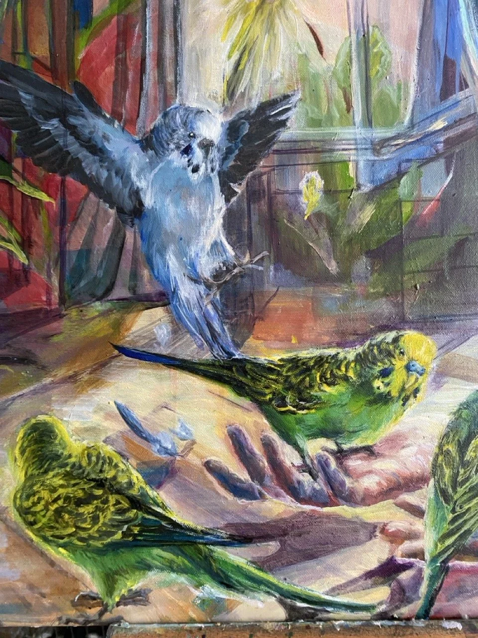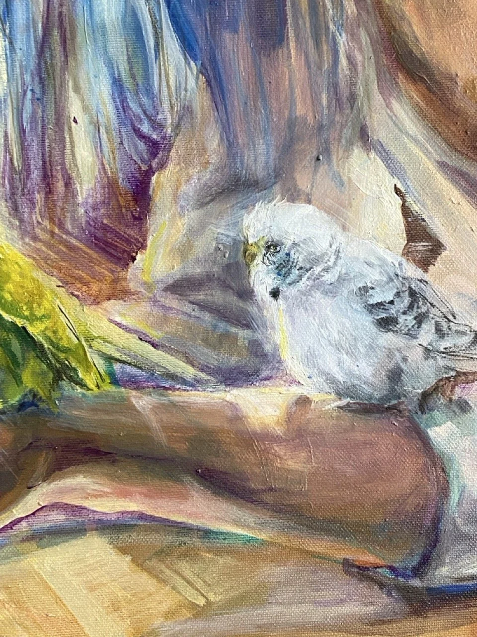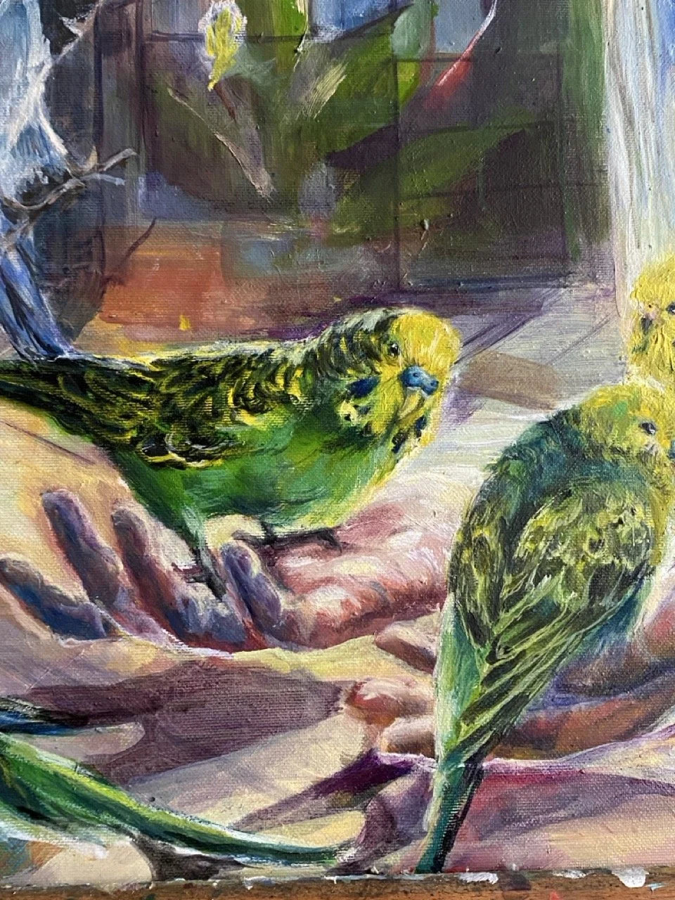 This painting is very personal to me. It shows a quiet moment with my birds, who are no longer with me. I painted it from memory — not just how they looked, but how it felt to be near them. Their movements, their sounds, the way they always filled the room with life.