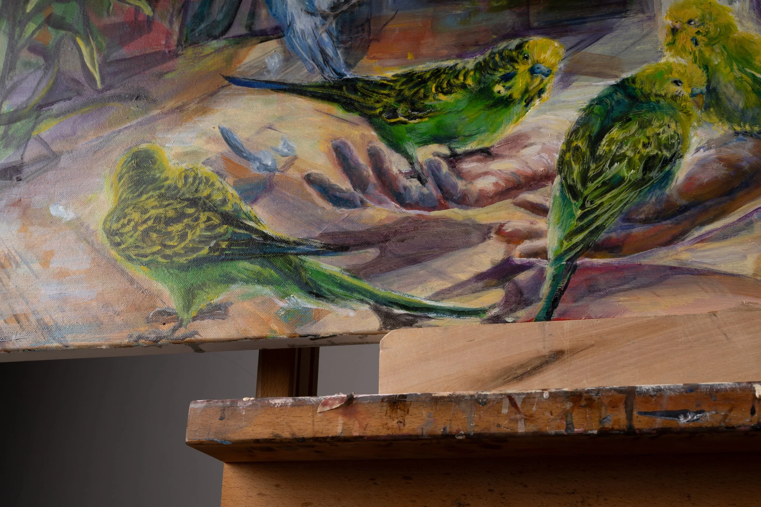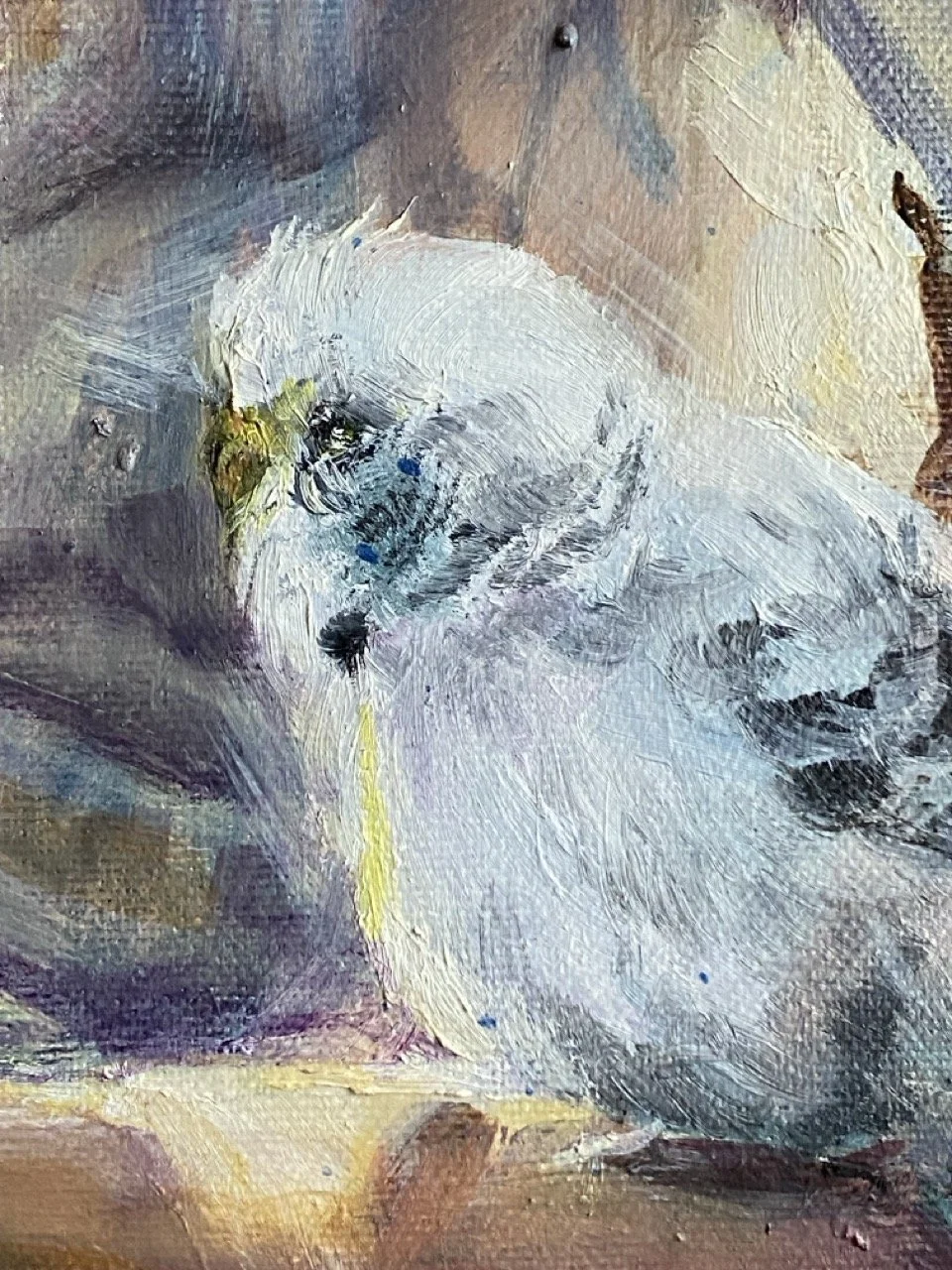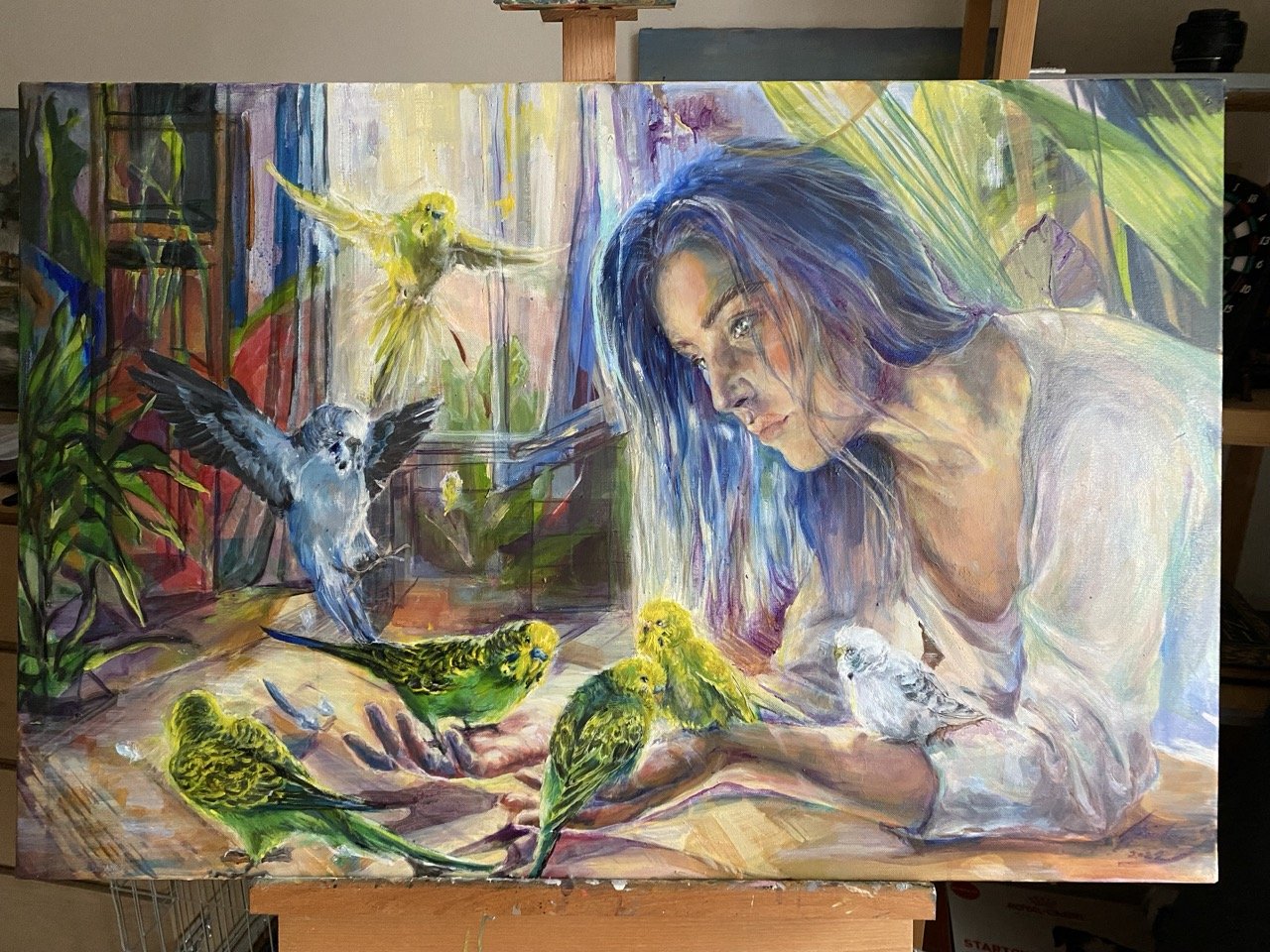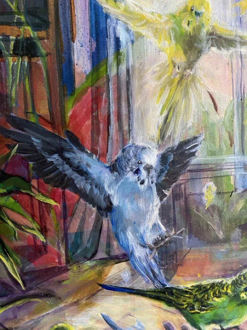 This painting is very personal to me. It shows a quiet moment with my birds, who are no longer with me. I painted it from memory — not just how they looked, but how it felt to be near them. Their movements, their sounds, the way they always filled the room with life.