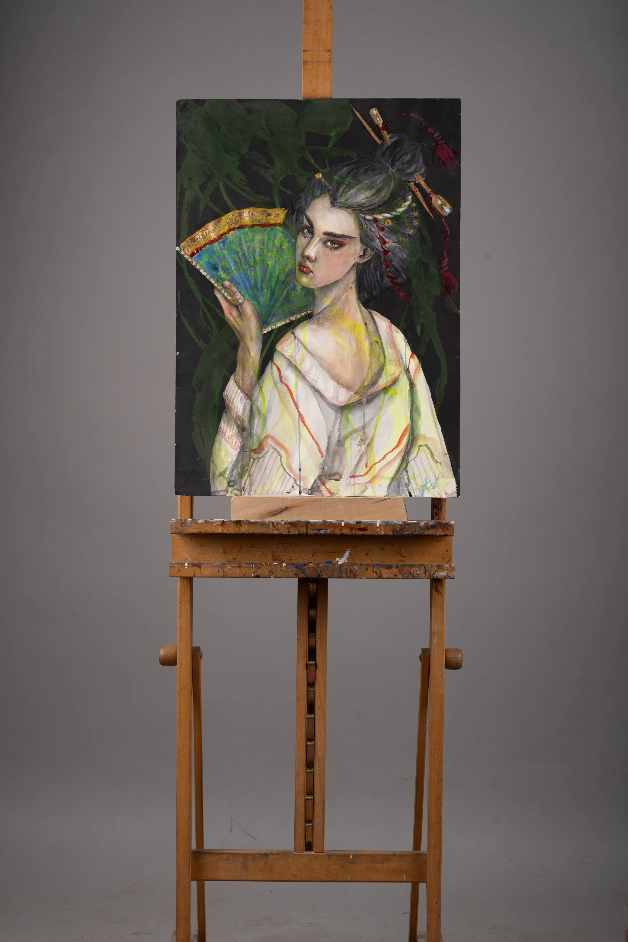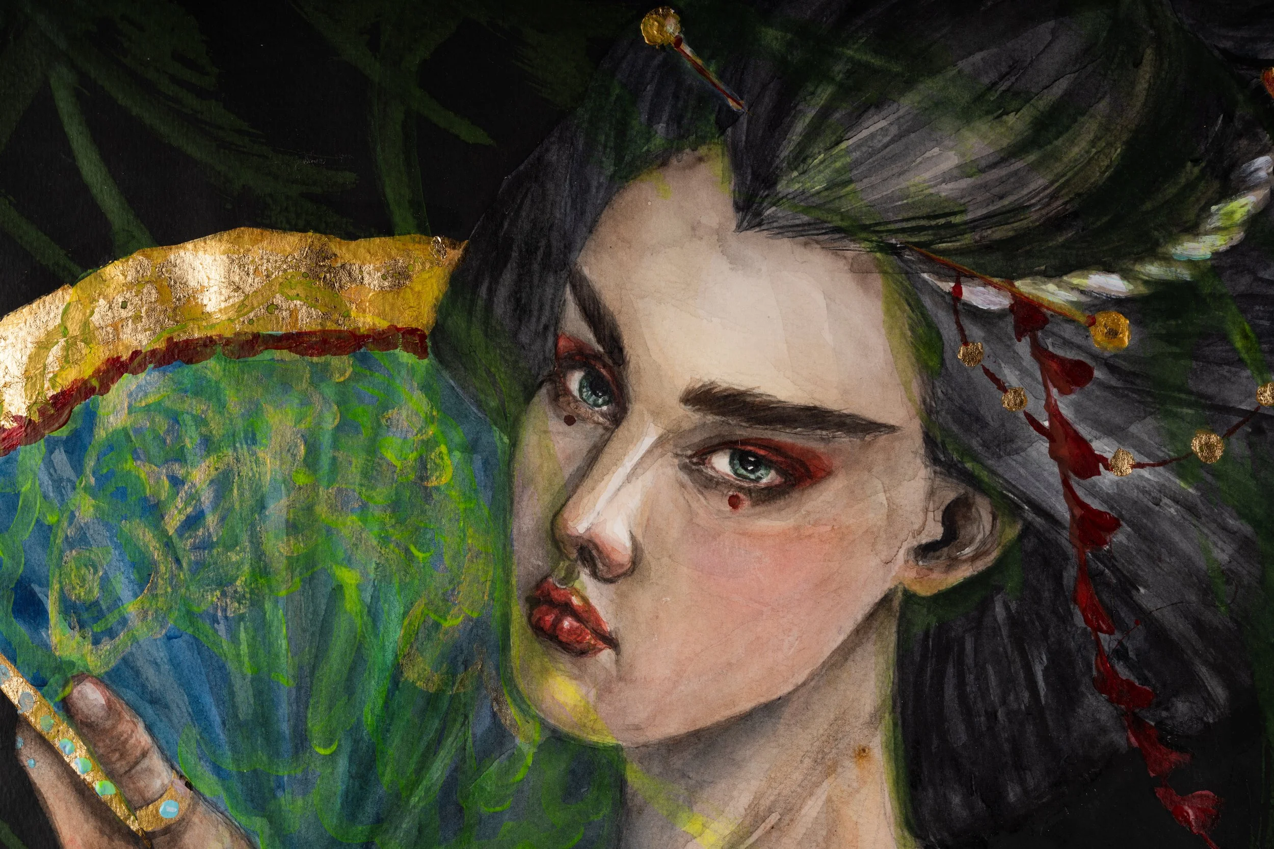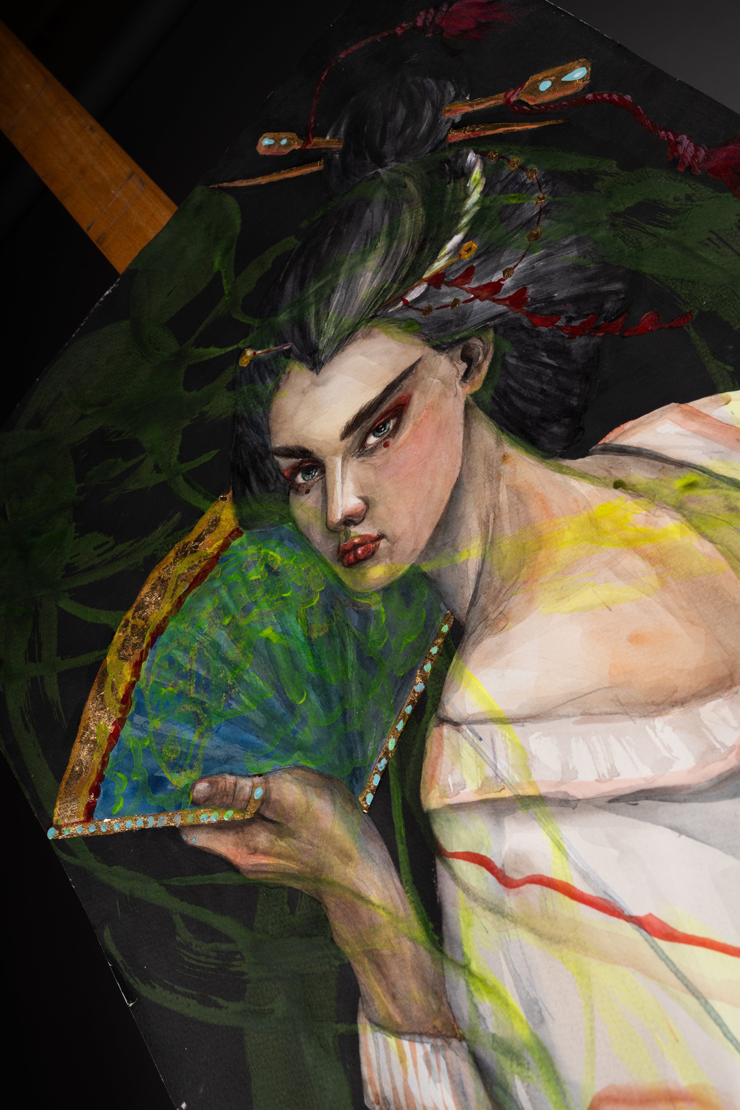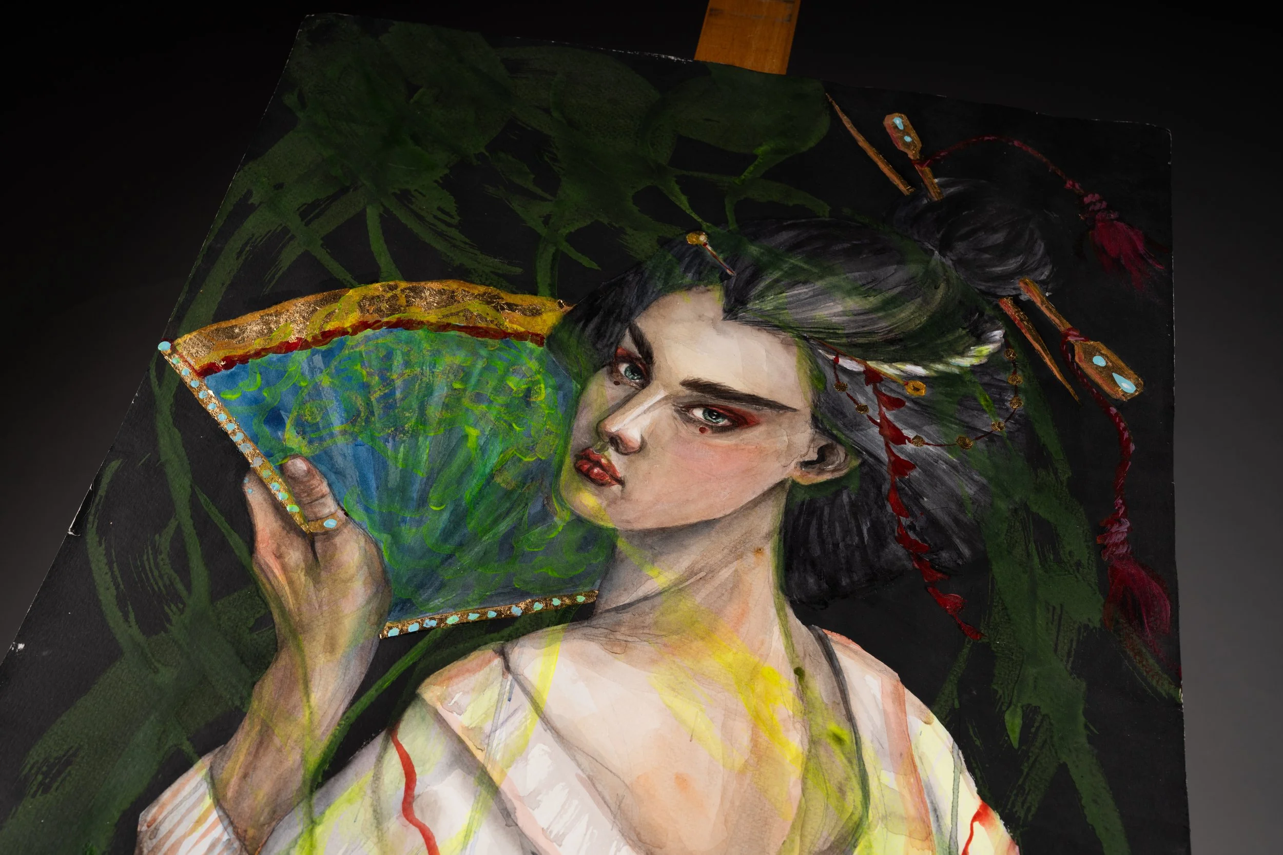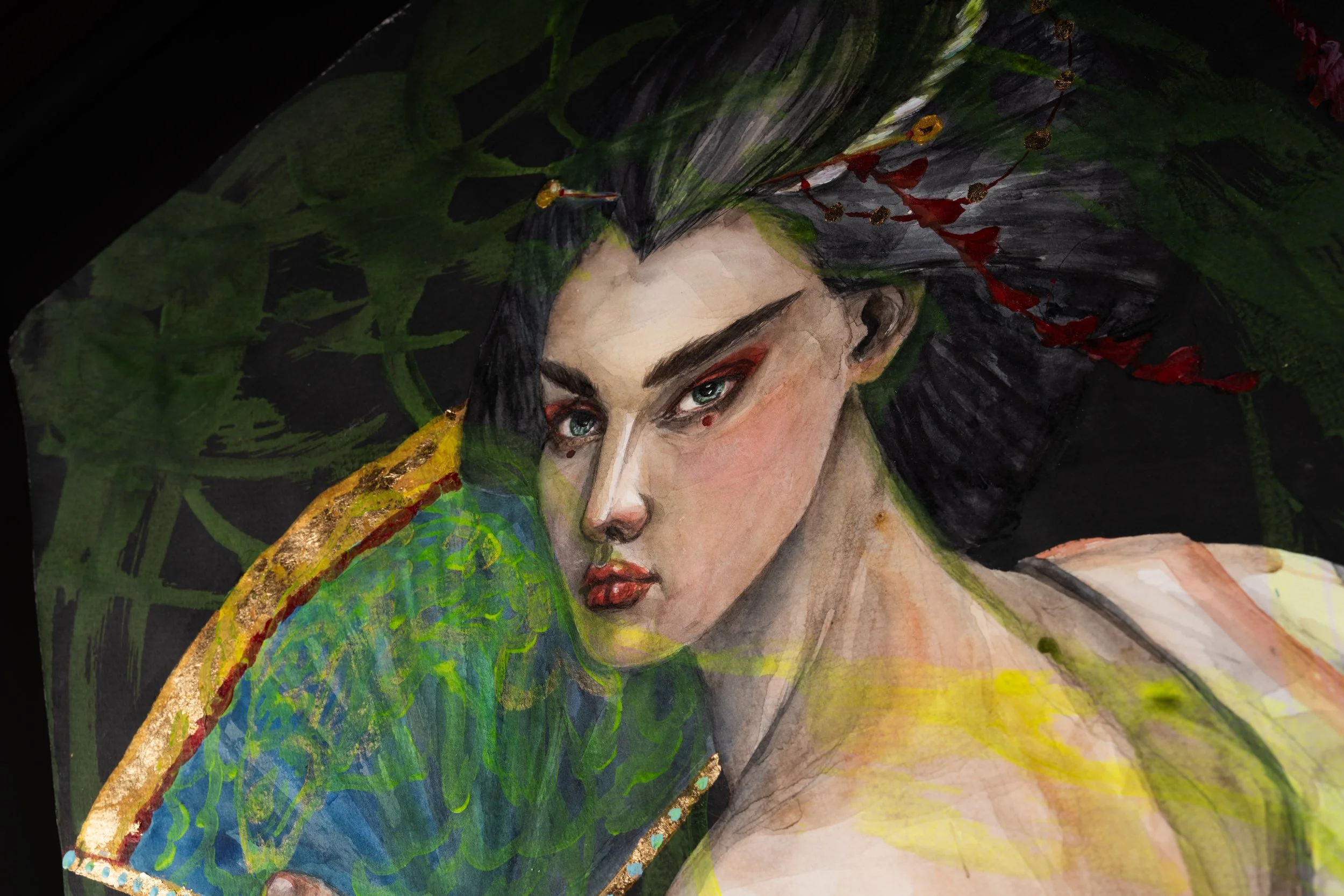 I was inspired by the quiet elegance and poise of traditional geishas when I painted this piece. The fan and the hair ornaments became ways to explore color and detail, but the focus for me was always on the expression — that subtle tension between serenity and something held inside.