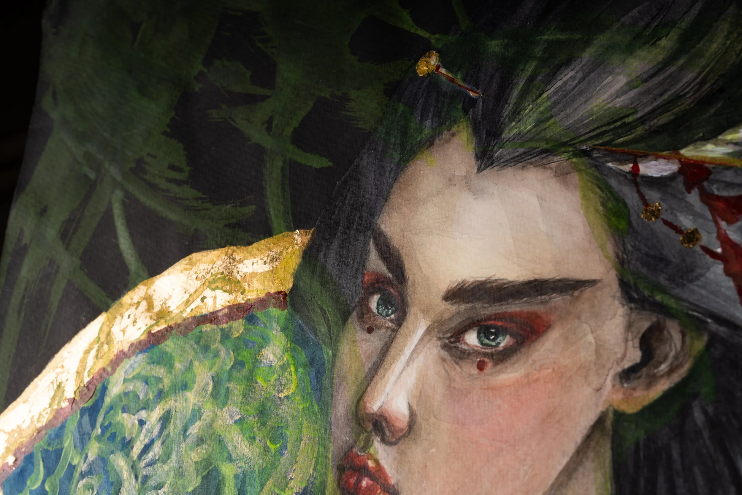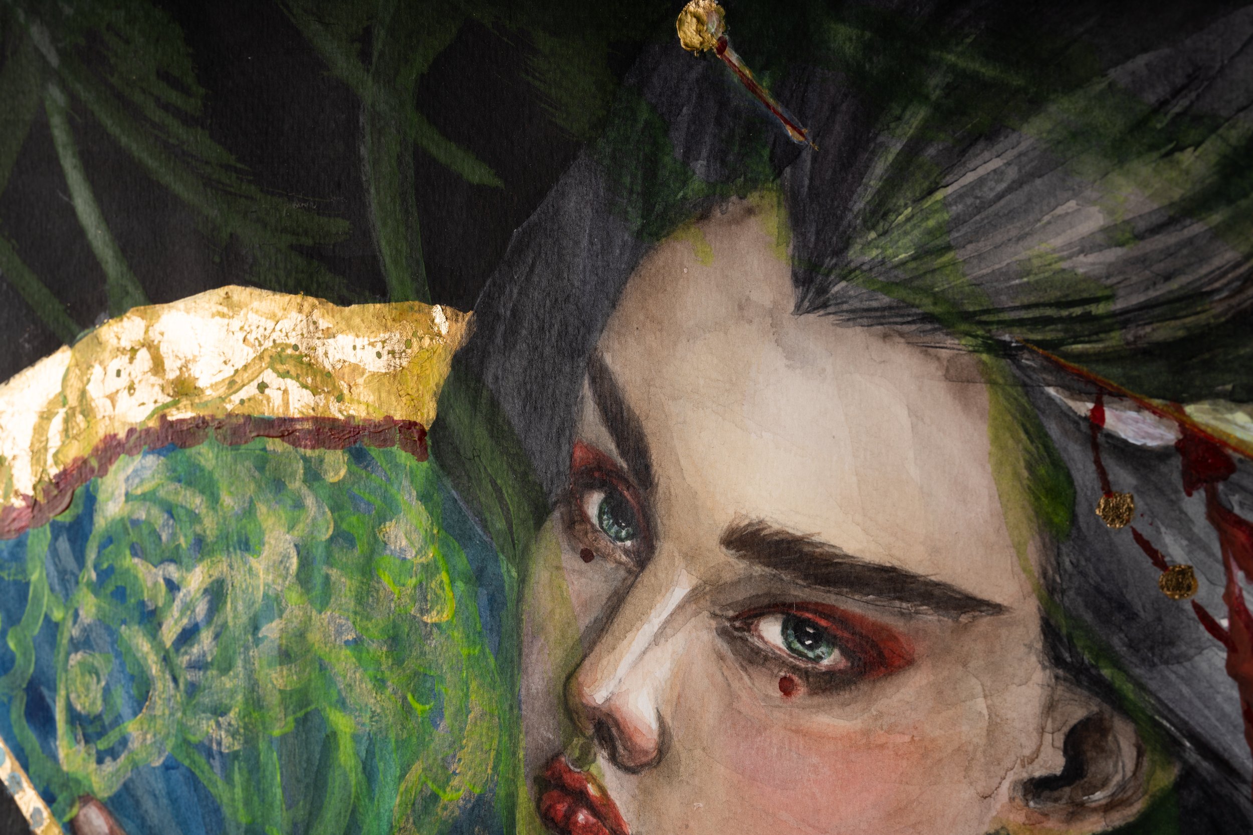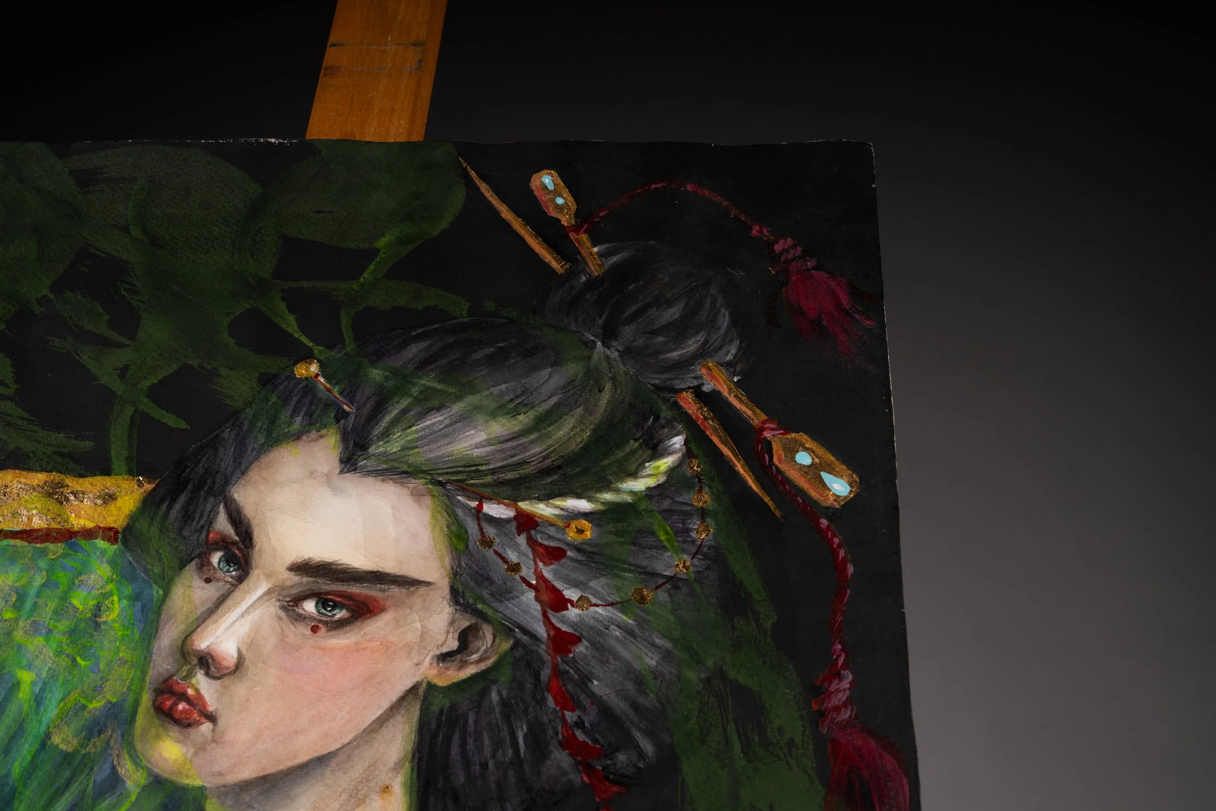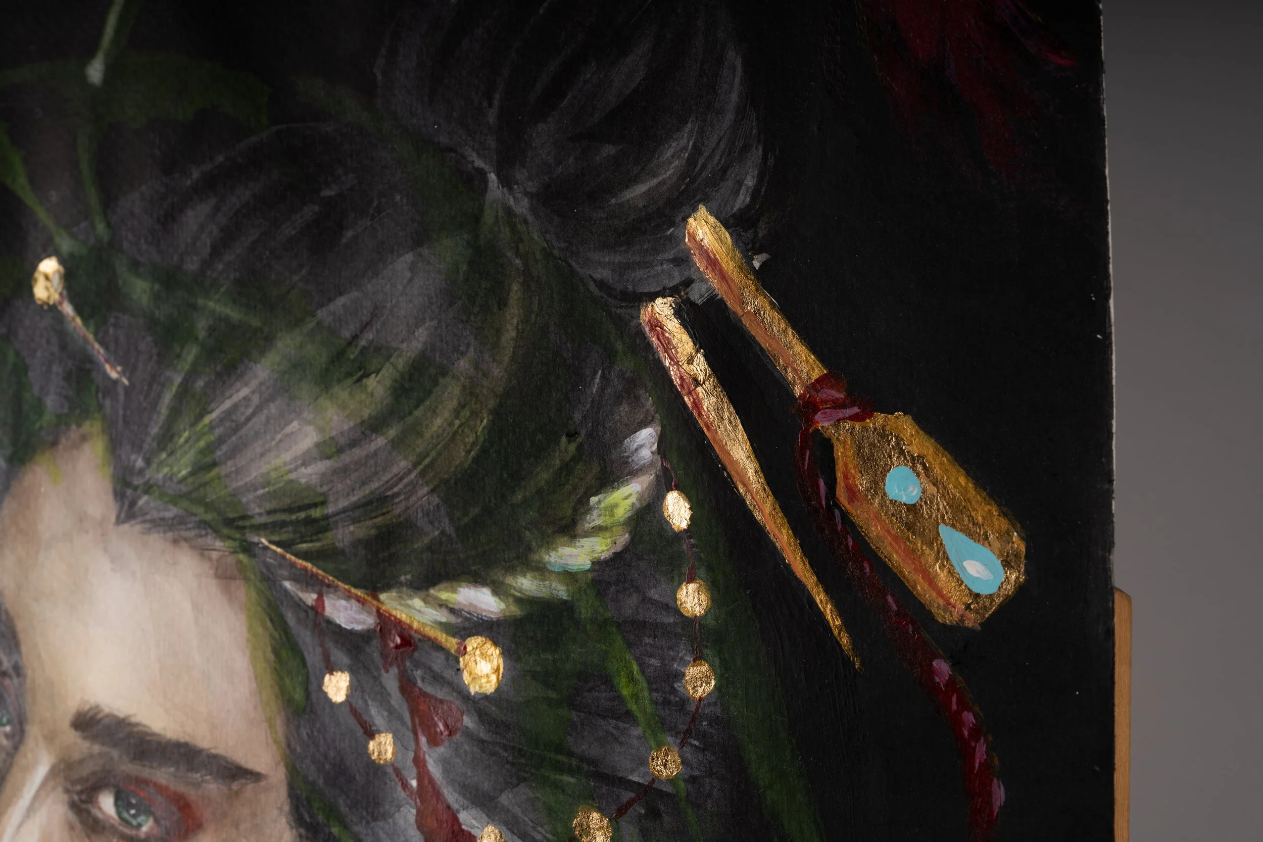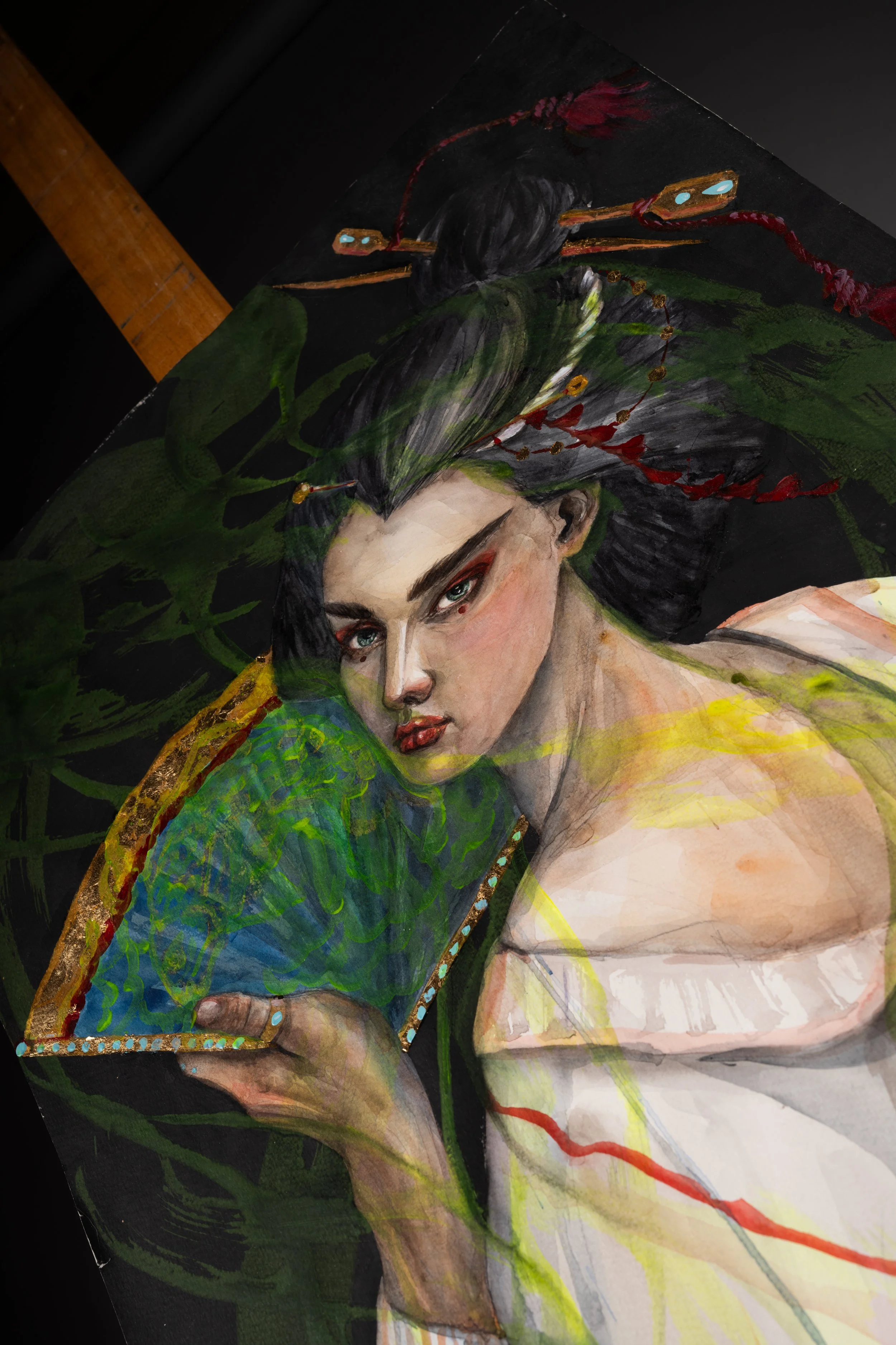 I was inspired by the quiet elegance and poise of traditional geishas when I painted this piece. The fan and the hair ornaments became ways to explore color and detail, but the focus for me was always on the expression — that subtle tension between serenity and something held inside.