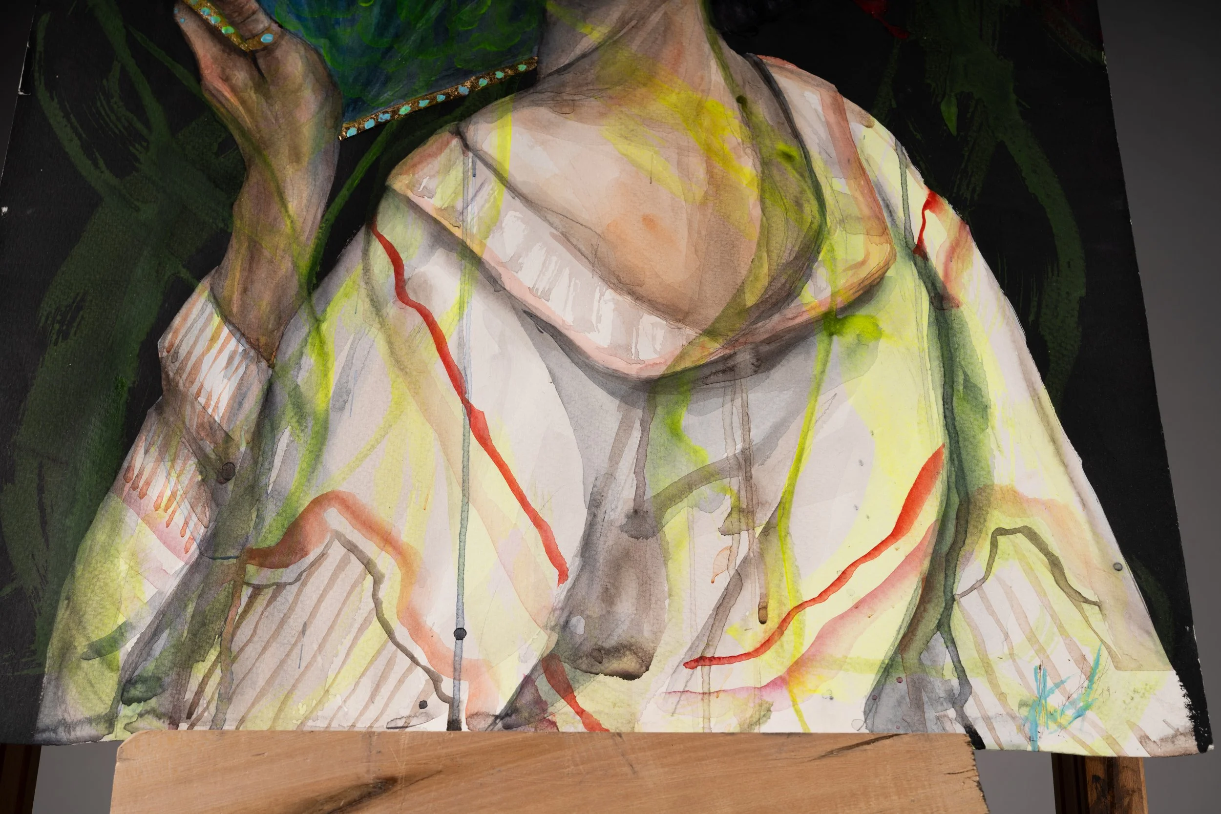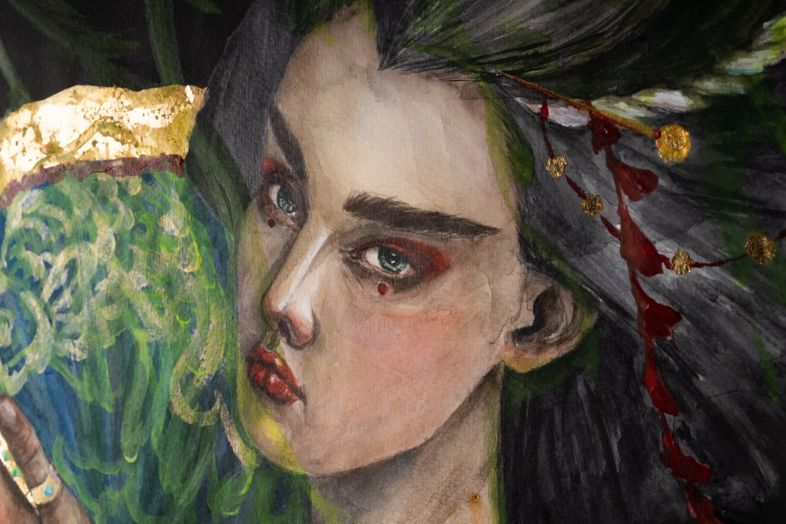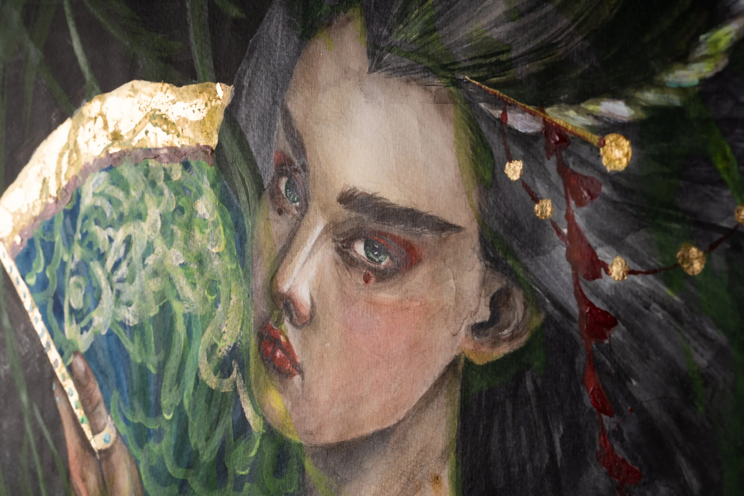 The dark background felt important; it allows the figure to exist in her own space, undisturbed, while the hints of green and the vibrant fan suggest life and movement around her. I wanted the painting to feel both soft and deliberate, like a moment captured in thought.