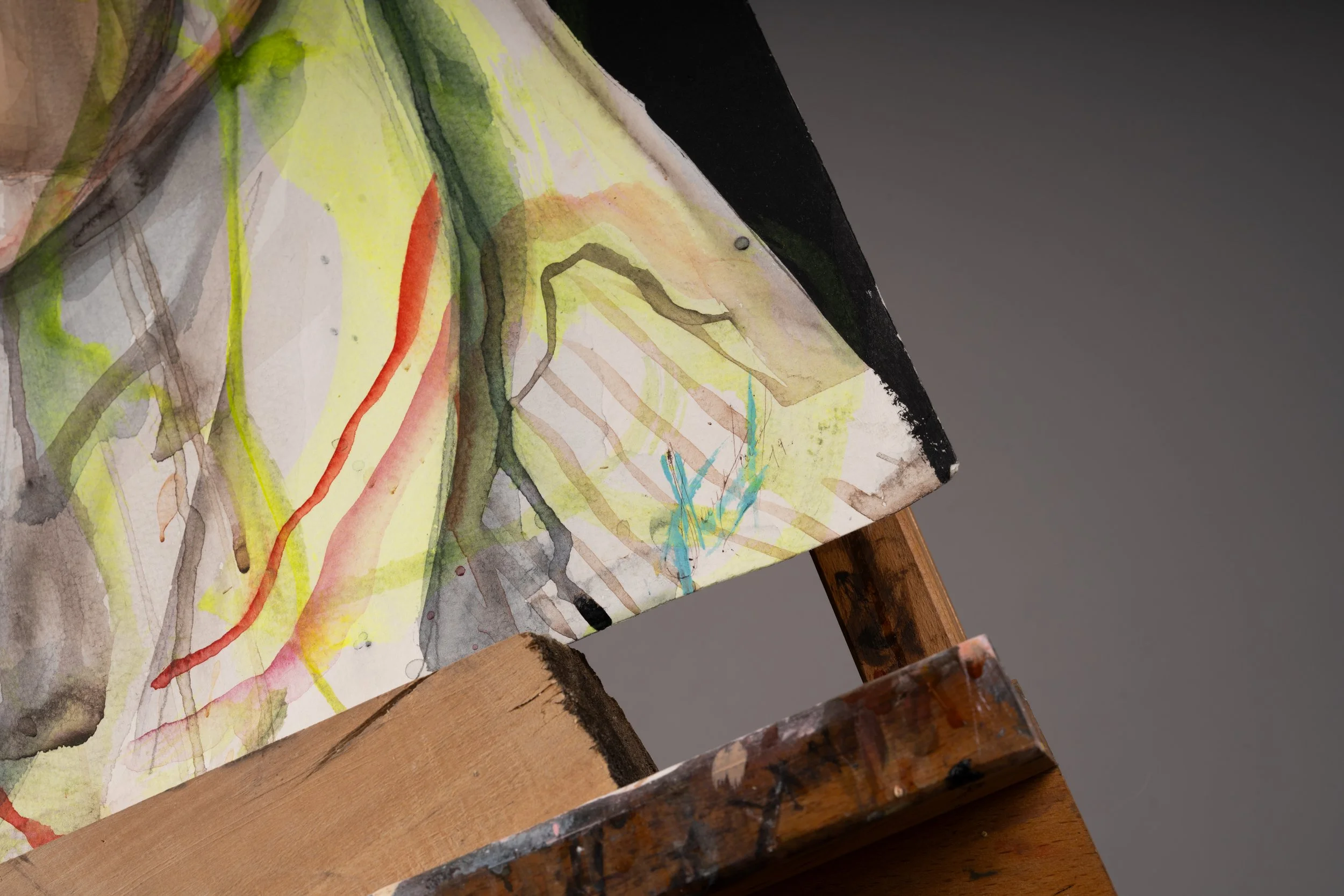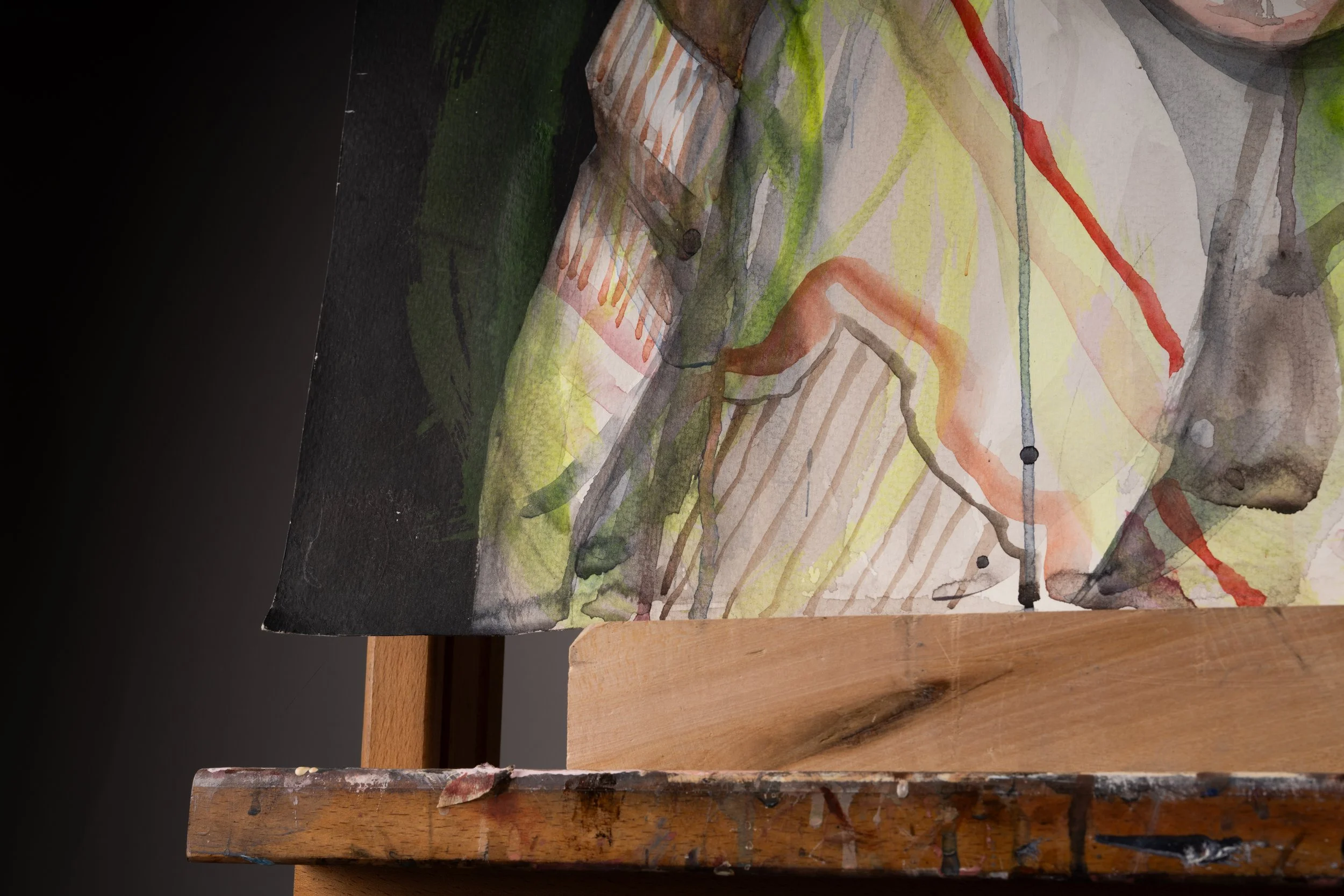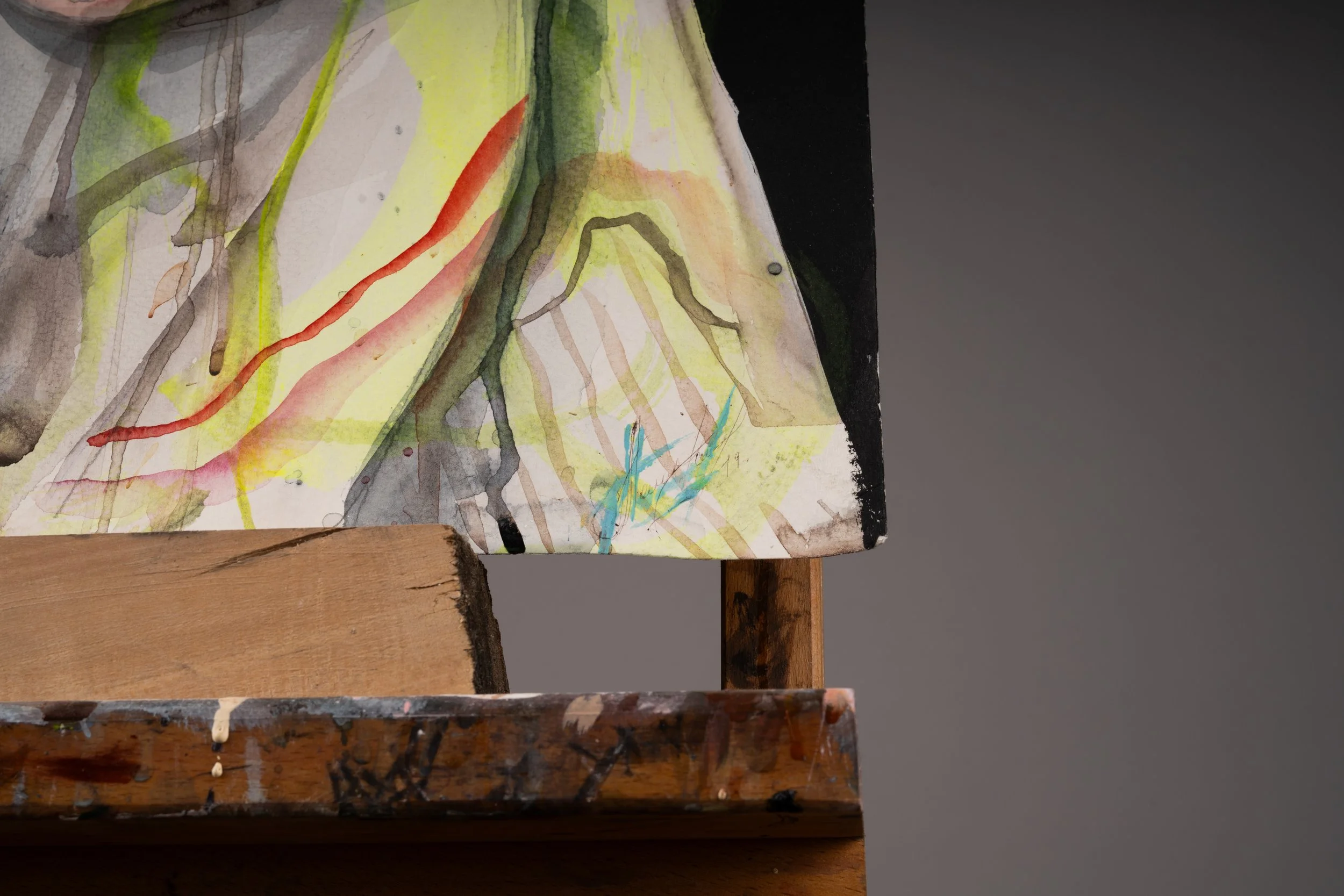 The dark background felt important; it allows the figure to exist in her own space, undisturbed, while the hints of green and the vibrant fan suggest life and movement around her. I wanted the painting to feel both soft and deliberate, like a moment captured in thought.