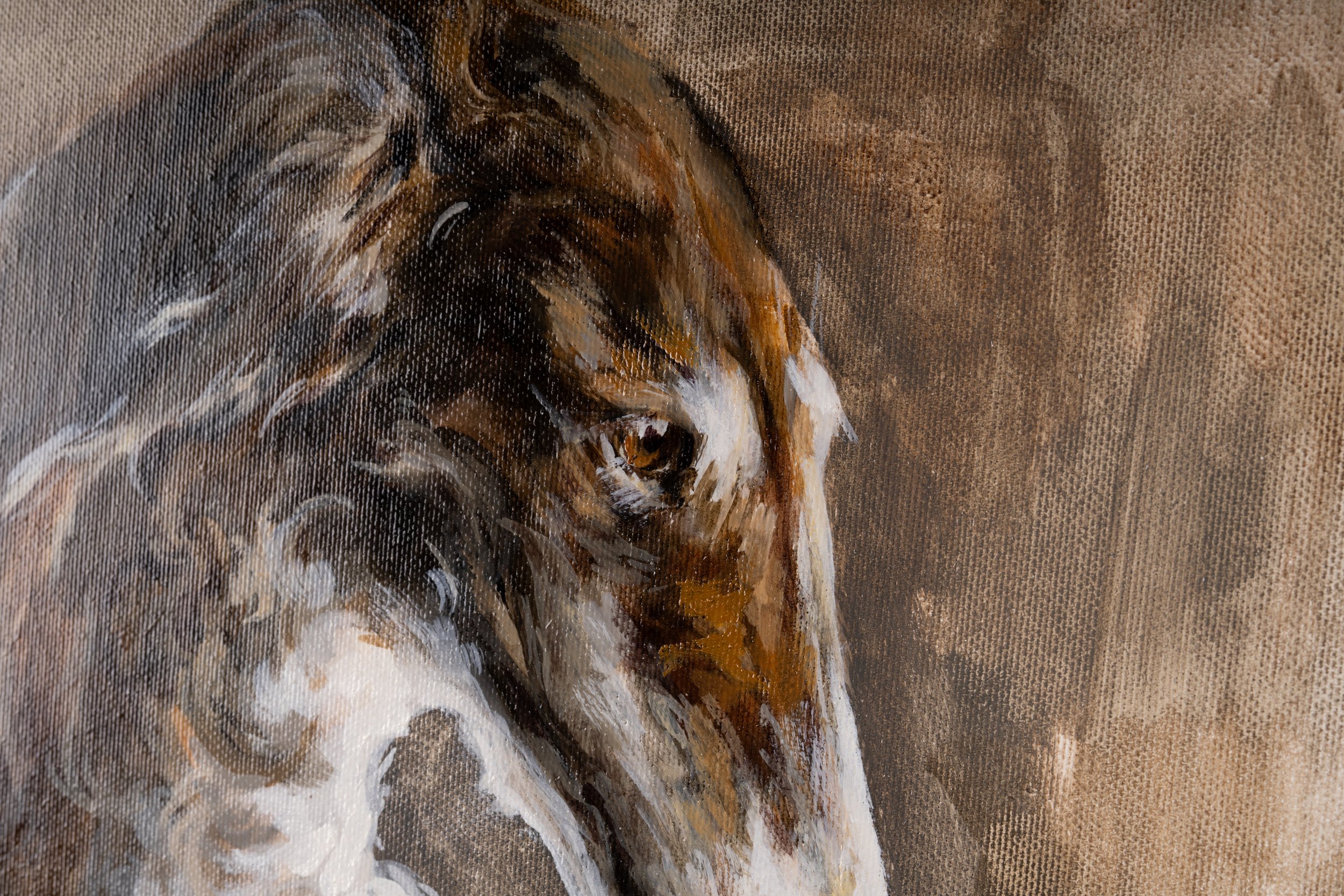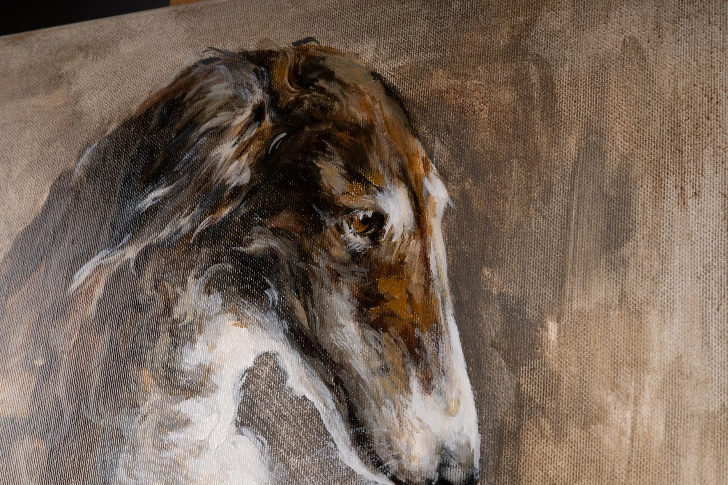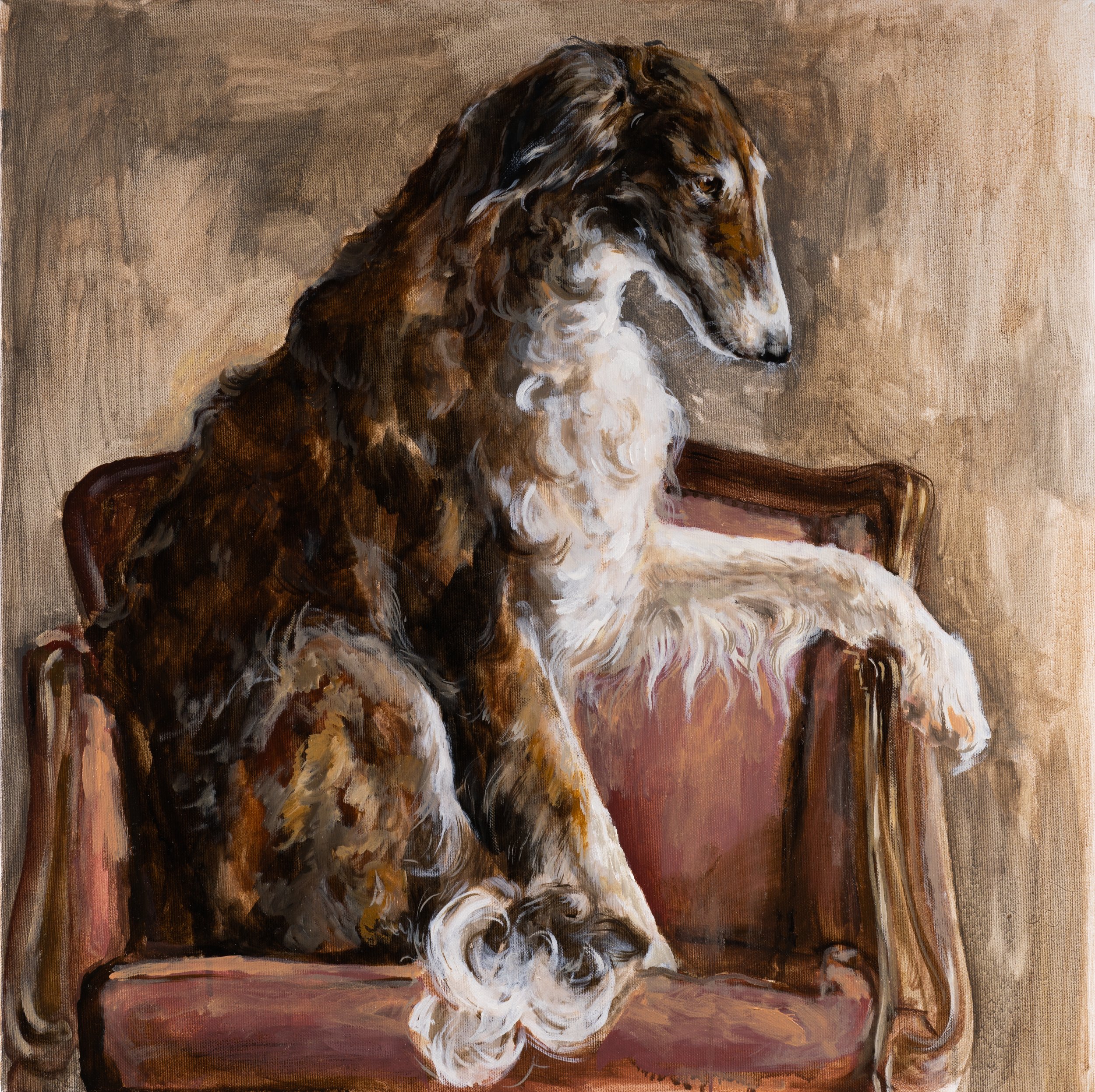 Borzoi is painted almost like a portrait, though instead of a person, it is the dignified figure of a Russian Borzoi. I placed the dog in an antique armchair, giving it the kind of setting once reserved for human sitters in classical portraiture. Its posture is gentle, almost slumped, with a quiet sadness in the eyes that felt important to capture. The maroon upholstery and the subdued, earthy background were chosen deliberately, not only to frame the Borzoi but also to create an atmosphere of age, memory, and stillness. As in much of my work, I wanted to connect past and present — evoking the traditions of classical portraiture while allowing a contemporary tenderness and vulnerability to emerge. For me, the painting holds both dignity and melancholy, inviting the viewer to pause and share in that contemplative quiet.