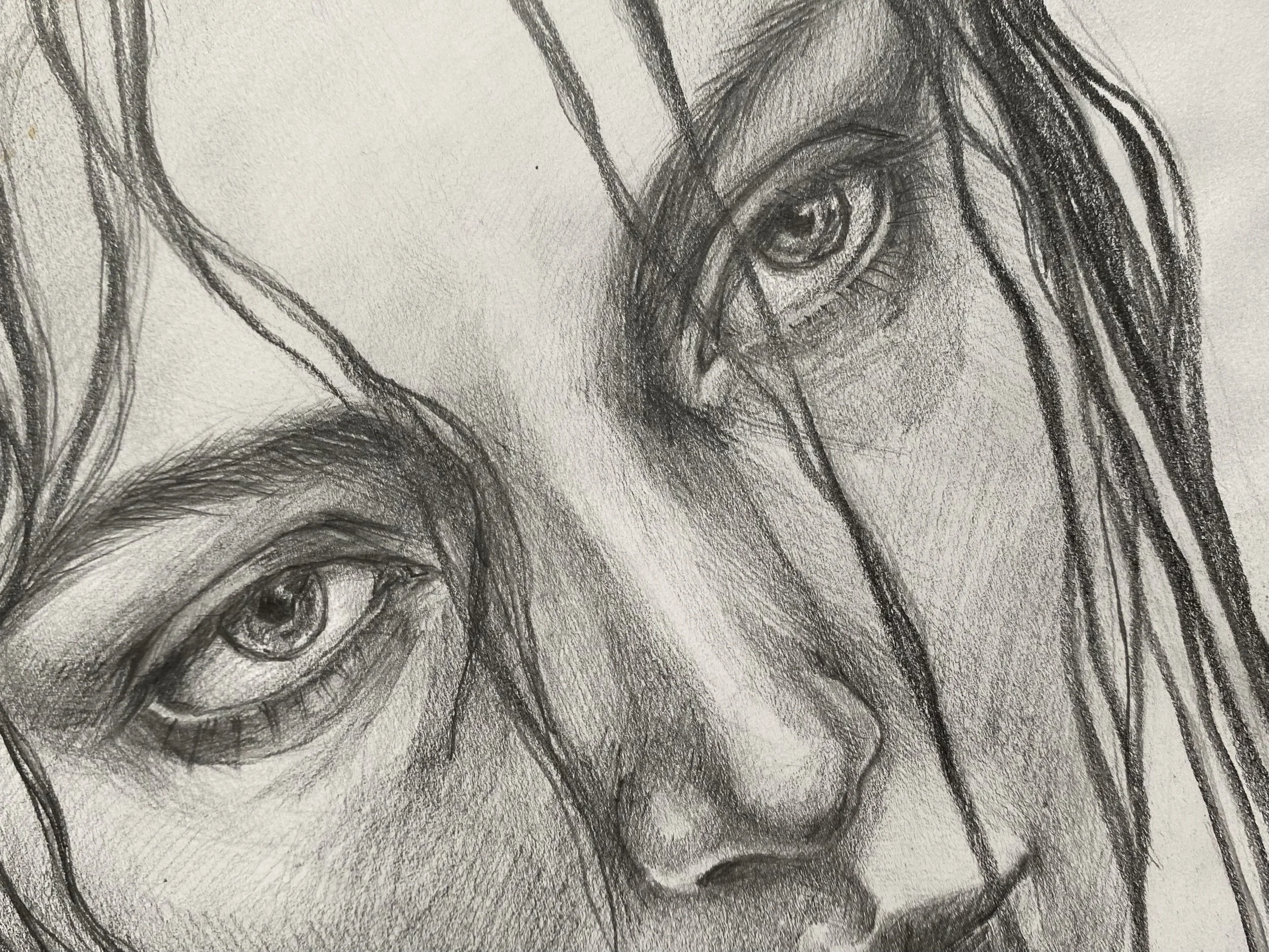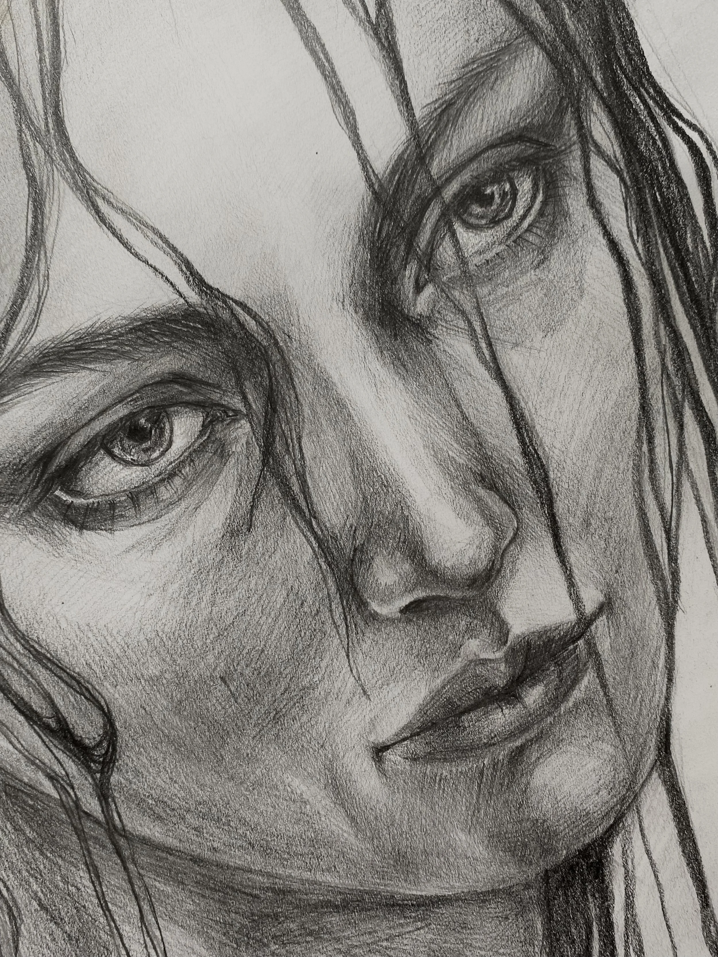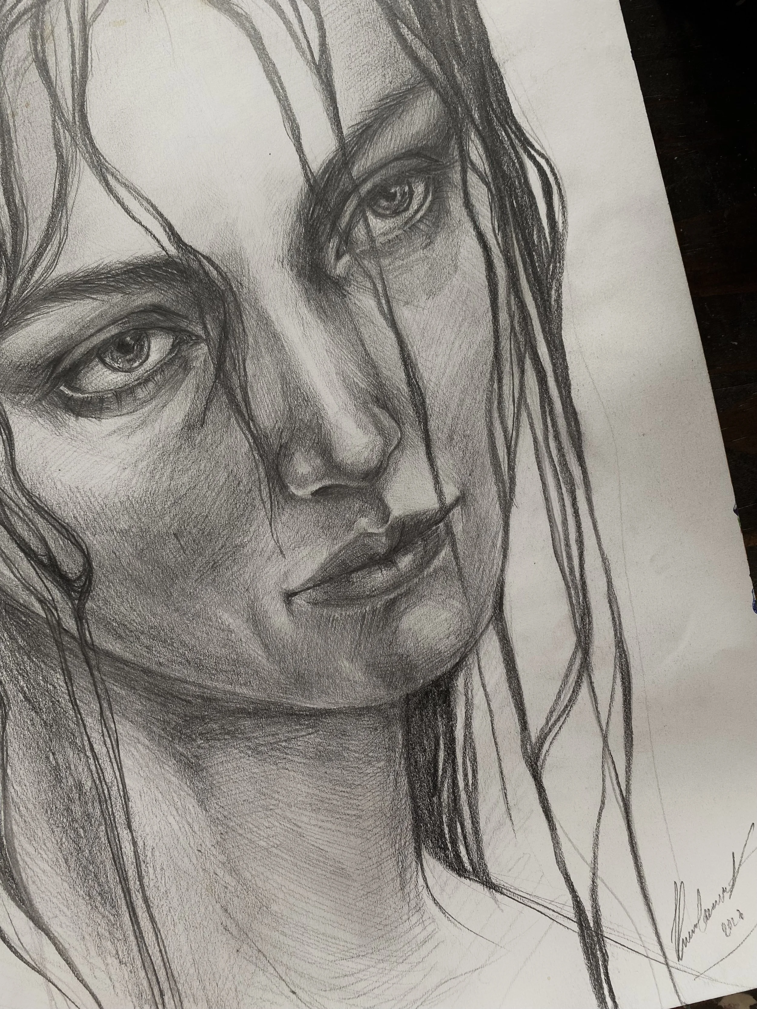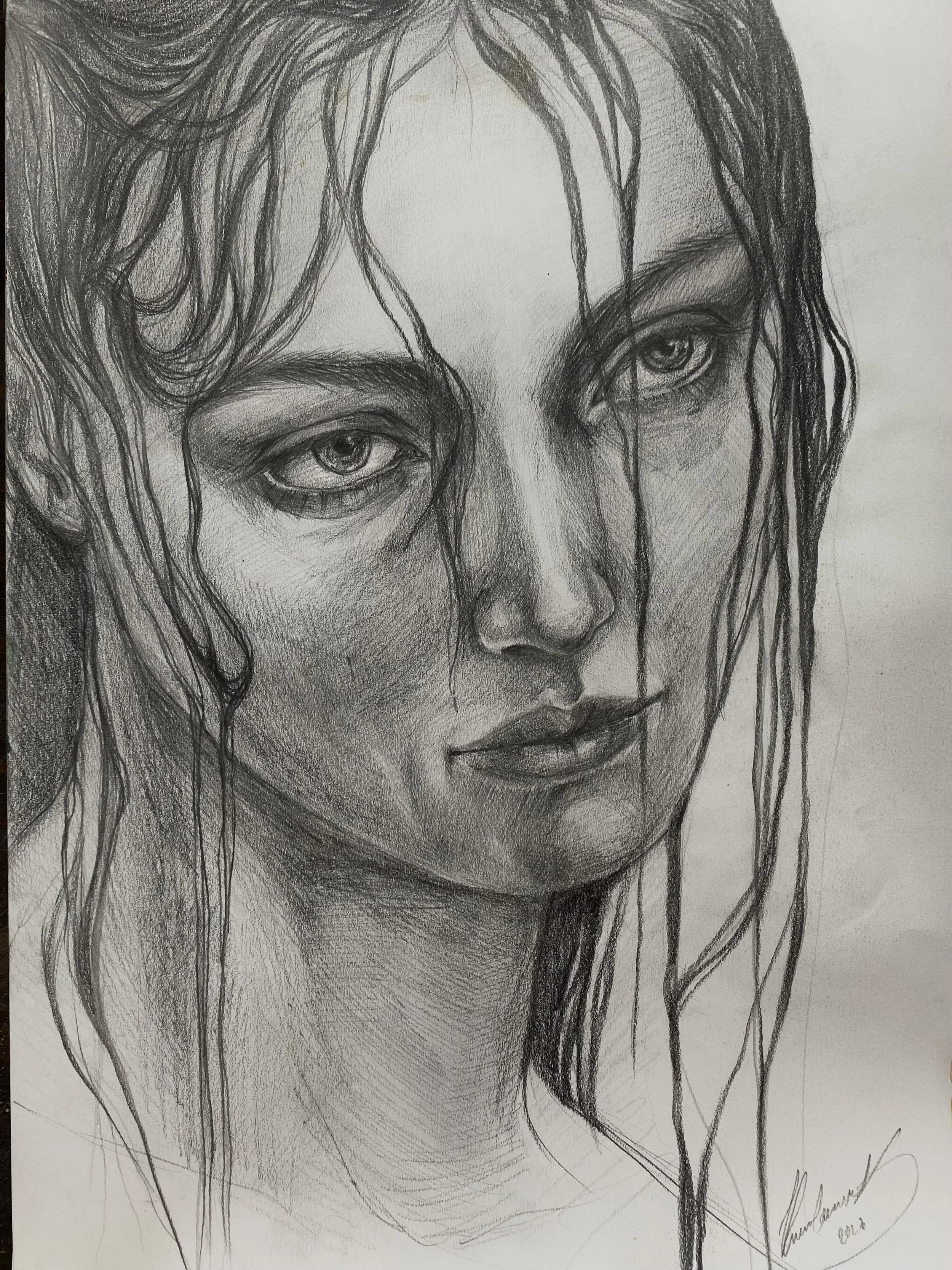 I drew this portrait in 2023, during one of the most difficult periods of my life. It isn’t a self-portrait, but it carries my own feelings from that time. The damp strands of hair, the heaviness in the eyes, the subdued expression — they reflect a kind of sadness I knew well. Working only in pencil kept it raw and unadorned, letting shadow and light do the speaking. For me, it was less about creating a likeness and more about giving shape to emotions I couldn’t put into words.