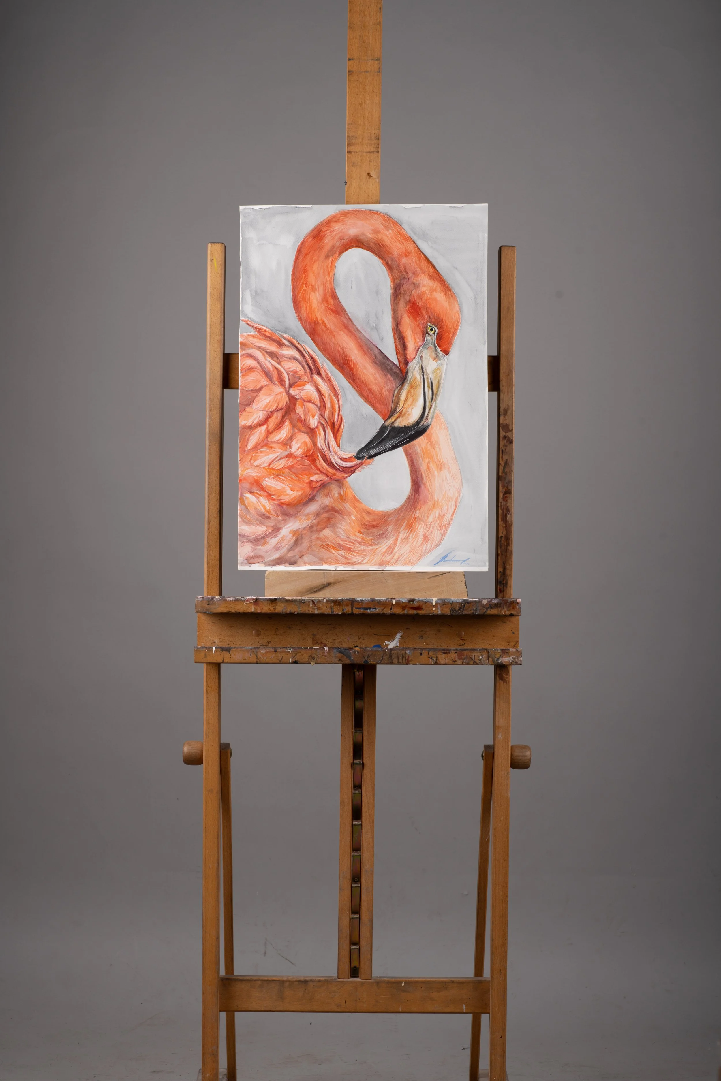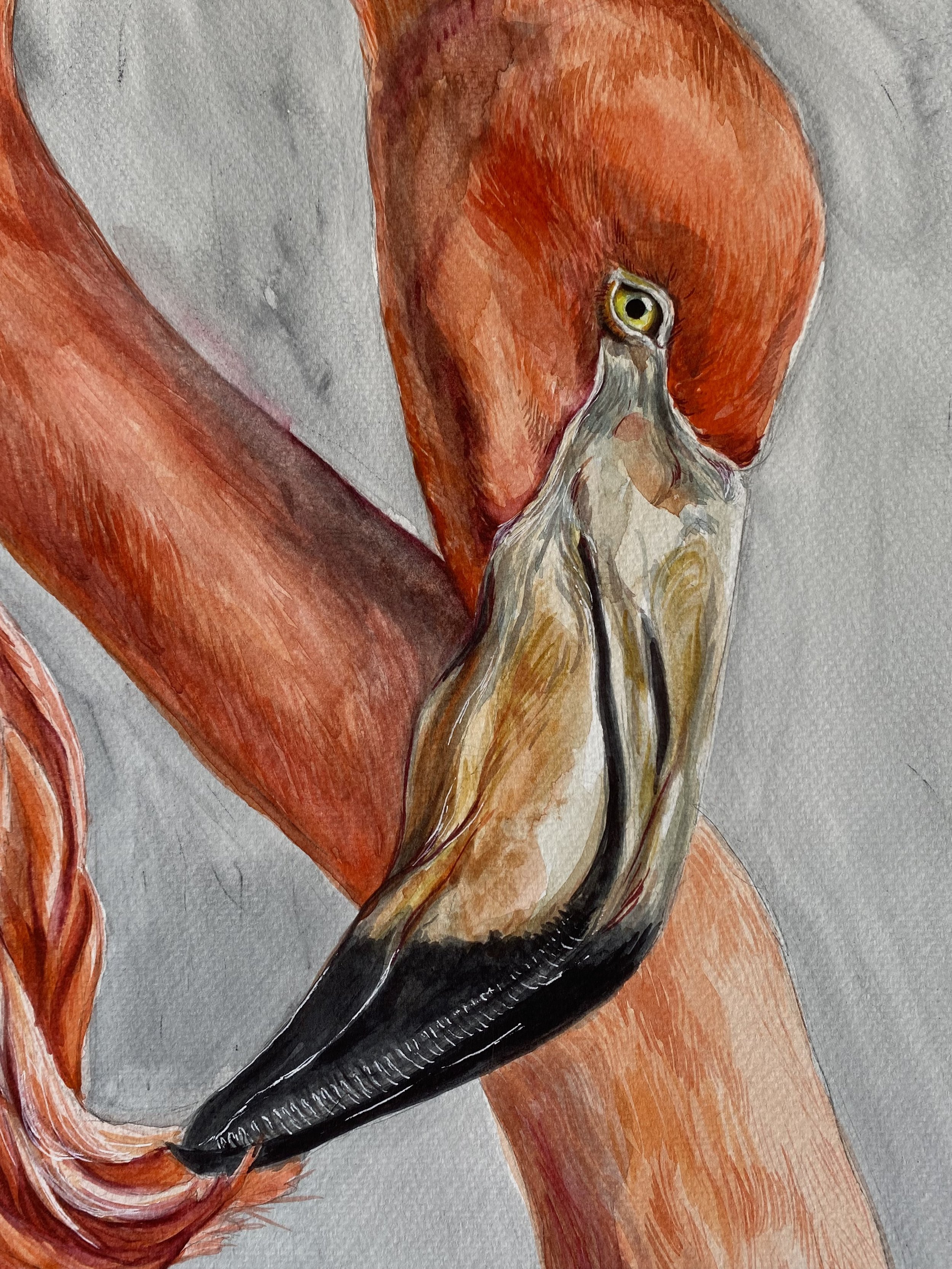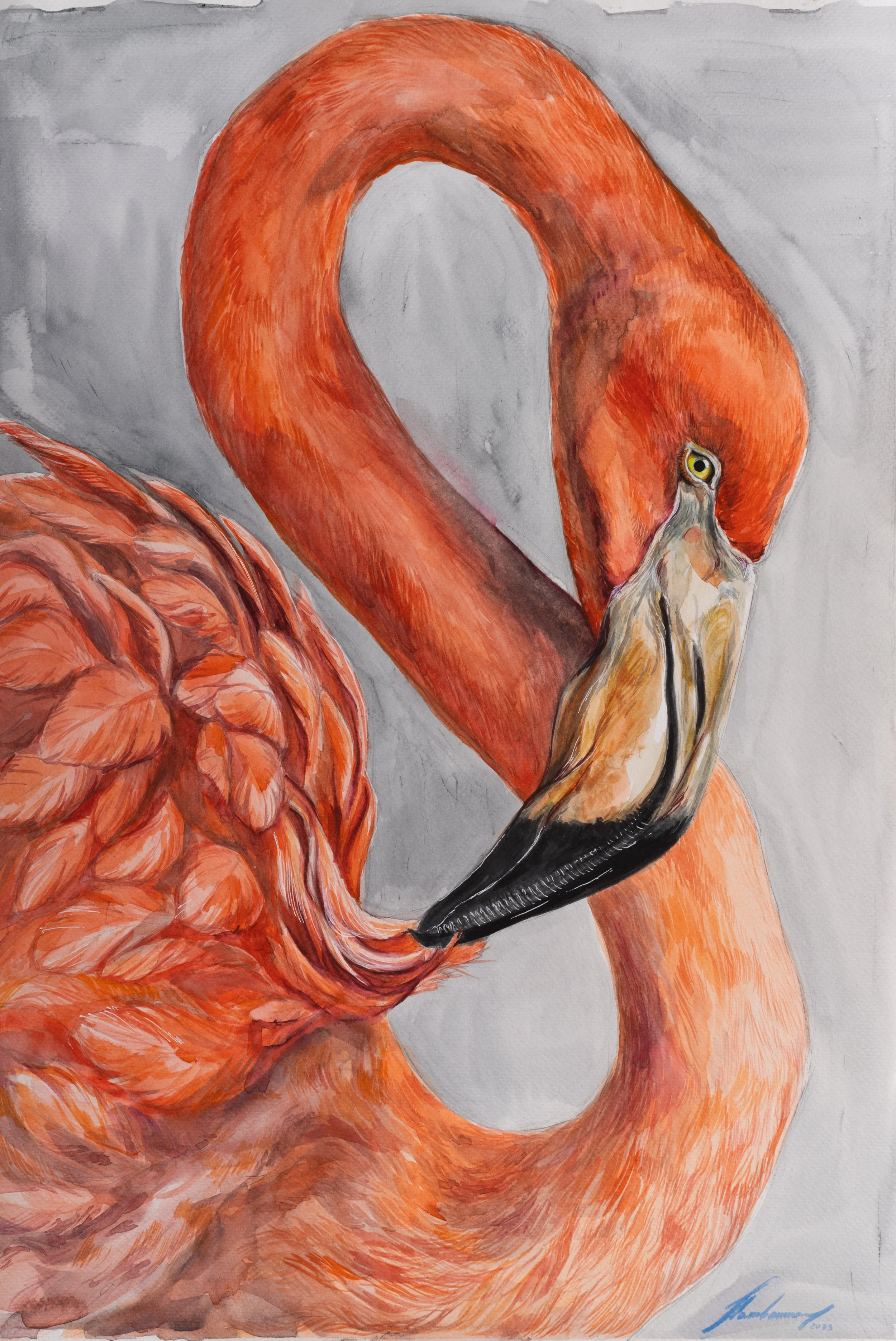 Flamingo is part of my 2023 Birds collection. I was drawn to the elegance of its form — the long neck curving into an ‘S,’ a line as simple as it is timeless. Watercolor let me layer shades of pink and coral until the feathers felt alive, soft yet luminous. Against the muted gray background, the bird stands in quiet focus, its colors speaking for themselves. Birds have appeared in art for centuries as symbols of grace, freedom, and beauty, and here I wanted to continue that dialogue while also letting the flamingo exist simply as itself: alert, balanced, and serene.