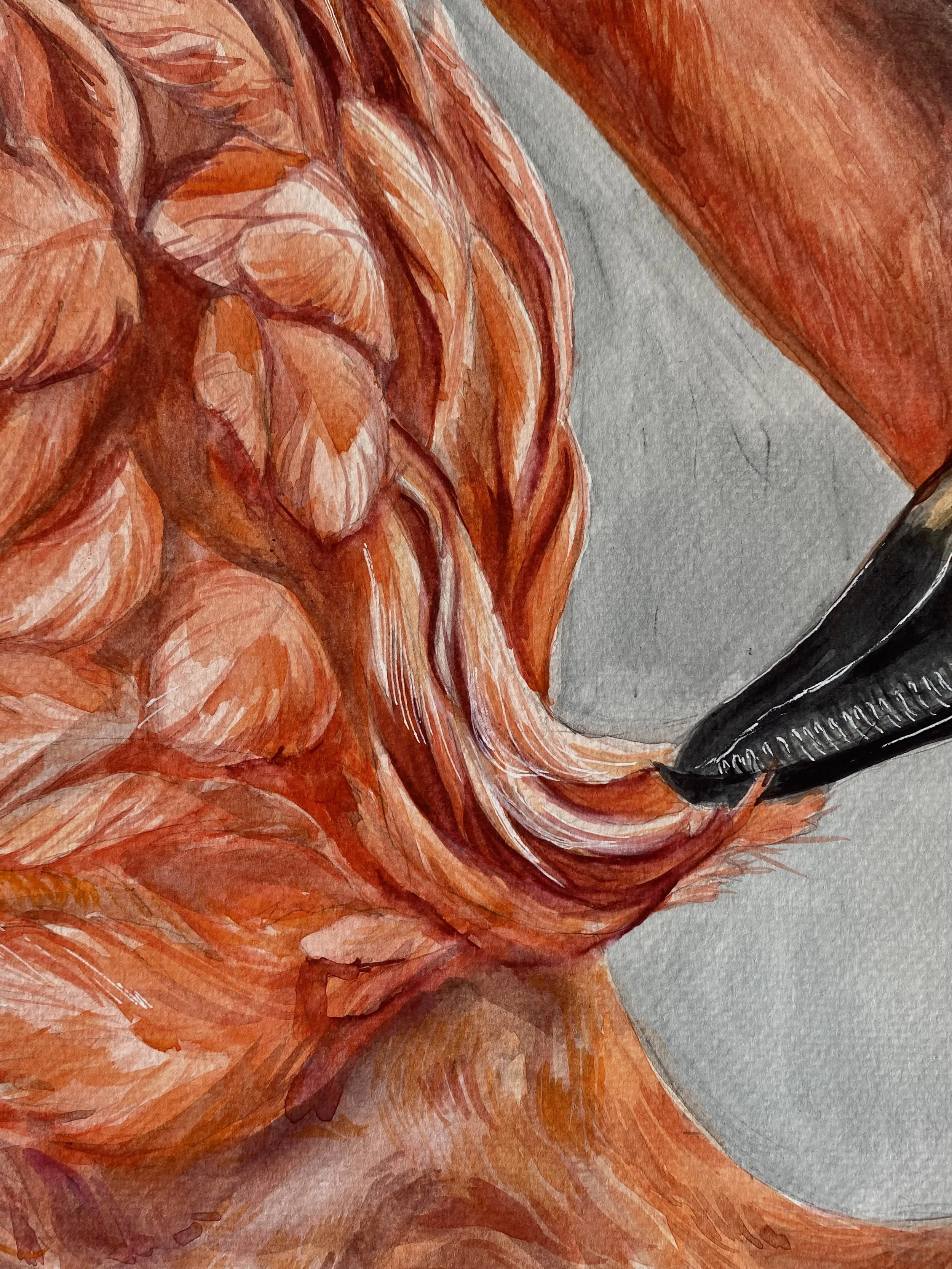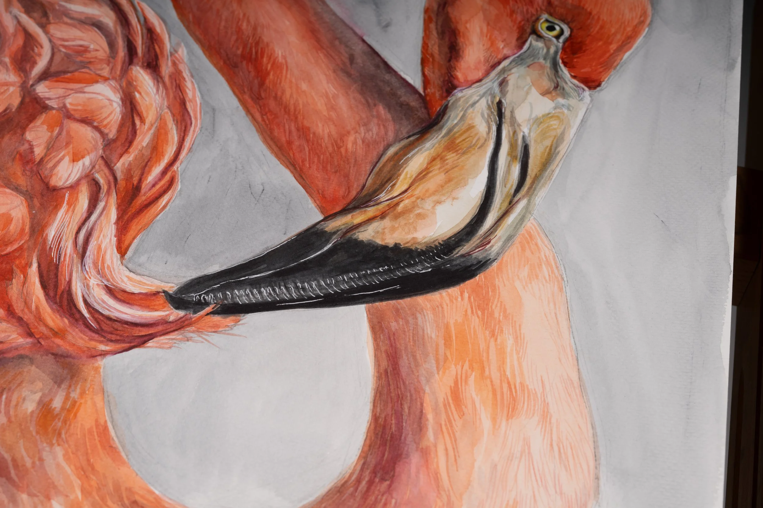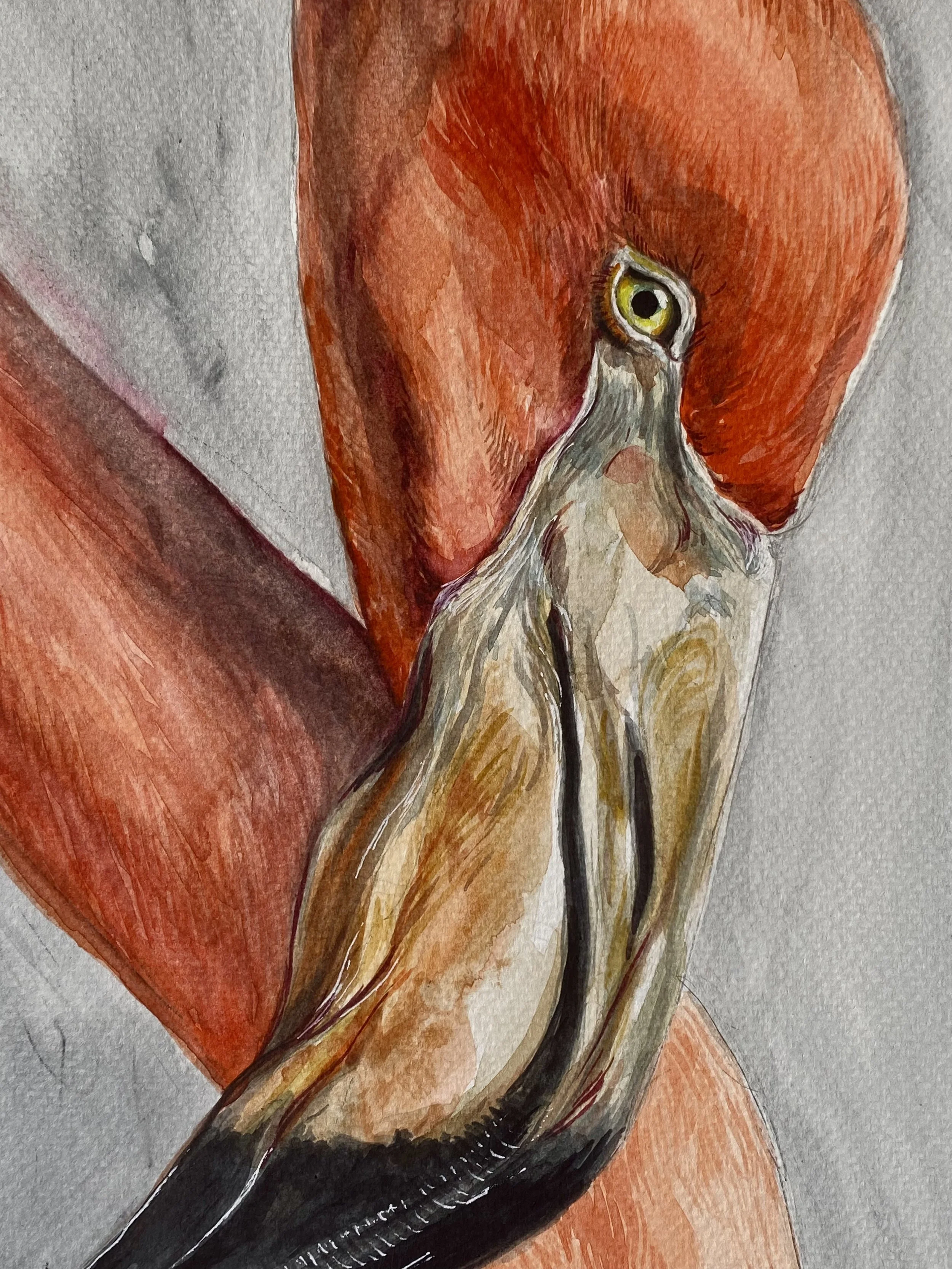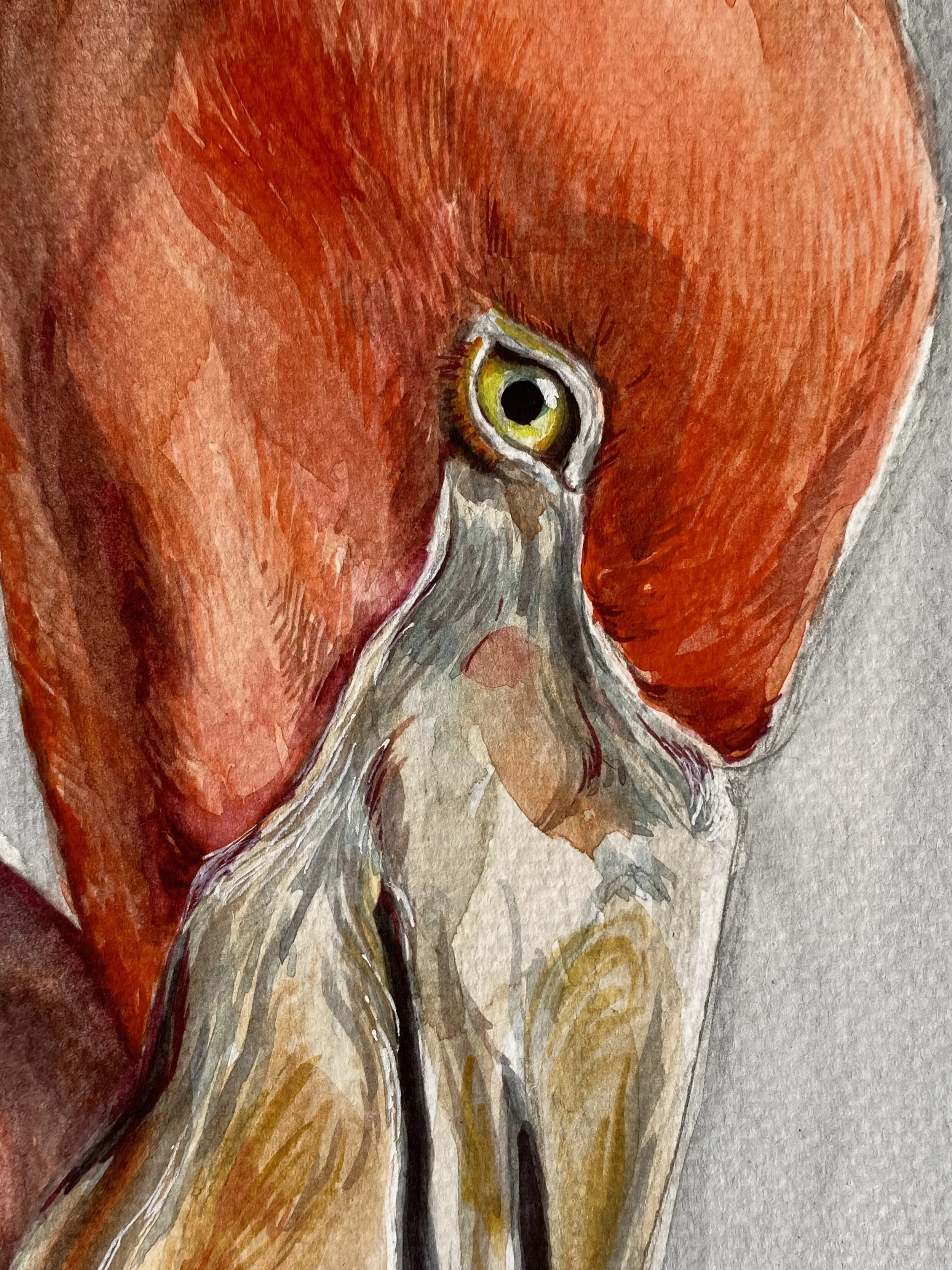 Flamingo is part of my 2023 Birds collection. I was drawn to the elegance of its form — the long neck curving into an ‘S,’ a line as simple as it is timeless. Watercolor let me layer shades of pink and coral until the feathers felt alive, soft yet luminous. Against the muted gray background, the bird stands in quiet focus, its colors speaking for themselves. Birds have appeared in art for centuries as symbols of grace, freedom, and beauty, and here I wanted to continue that dialogue while also letting the flamingo exist simply as itself: alert, balanced, and serene.