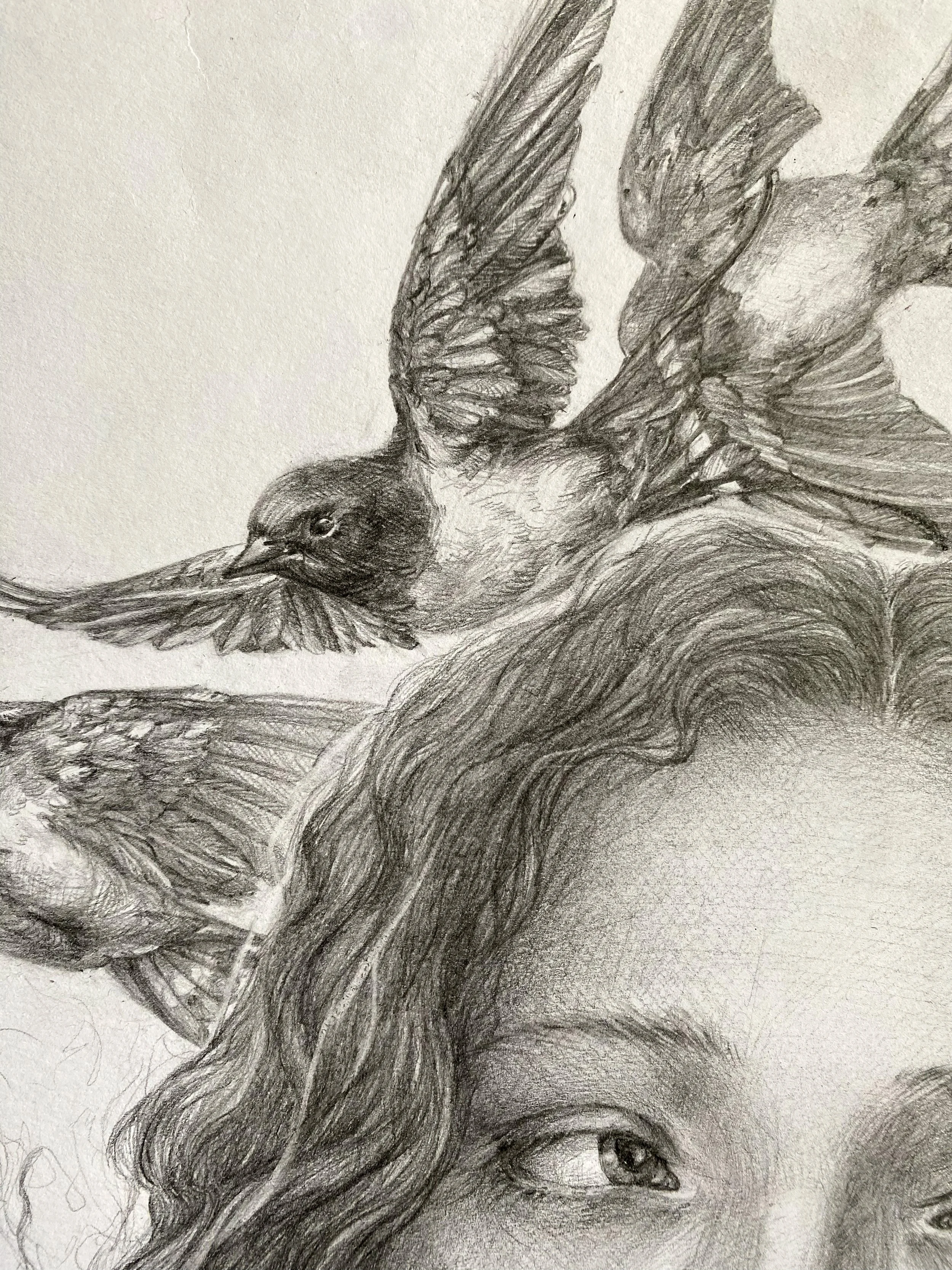 Spring Awakening grew from my fascination with how the human figure can exist in dialogue with nature. I drew the woman and the surrounding birds and flowers together as if they were part of one rhythm — hands, wings, petals, and hair moving into each other. The crow stands as a darker presence, a counterpoint to the lighter birds, while the flowers and moth remind me of how fragile and cyclical life is. I chose pencil to keep the focus on form and atmosphere, without the distraction of color, echoing older traditions of allegorical drawing. For me, it is about balance — calm against movement, light against shadow, transience against renewal.